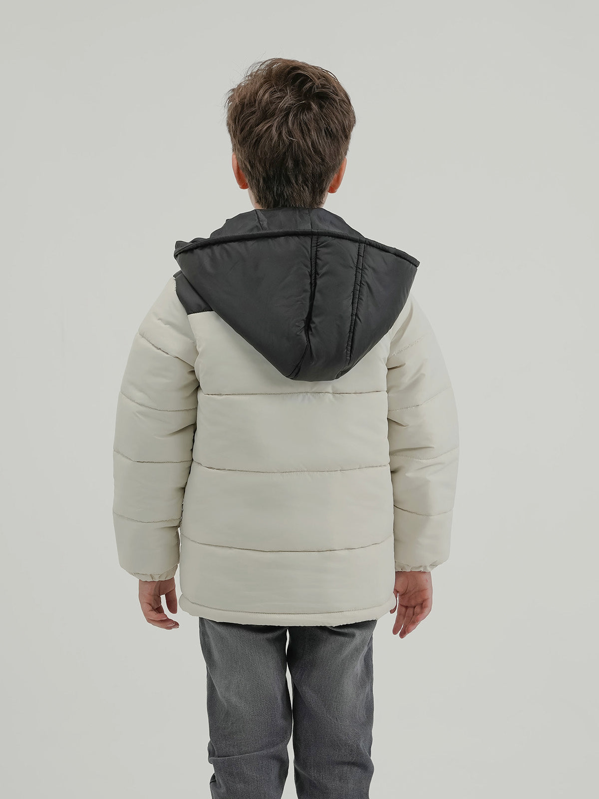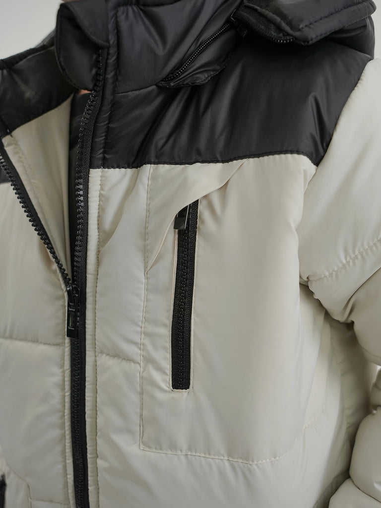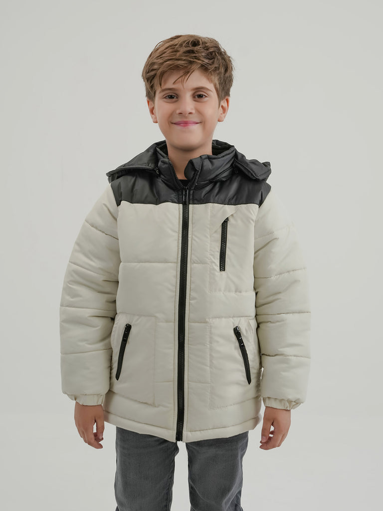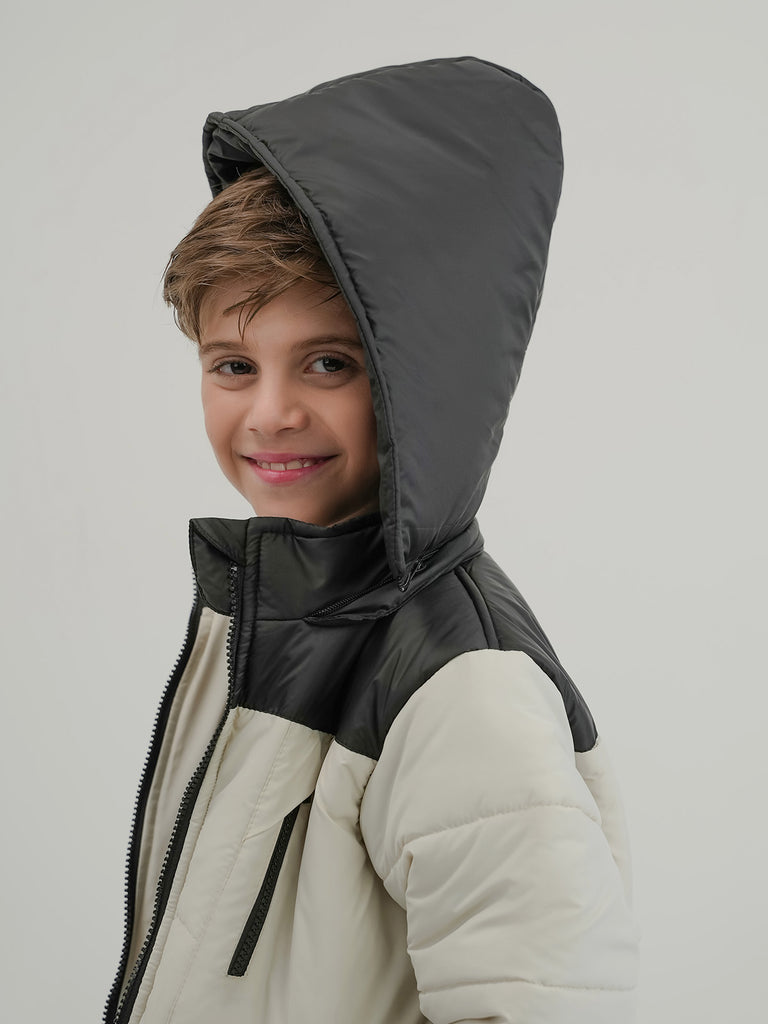 This boys' bubble puffer jacket is designed to keep your child warm and cozy during cold days. Featuring a hood, full sleeves, and made from 100% polyester, it offers a regular fit for easy movement.