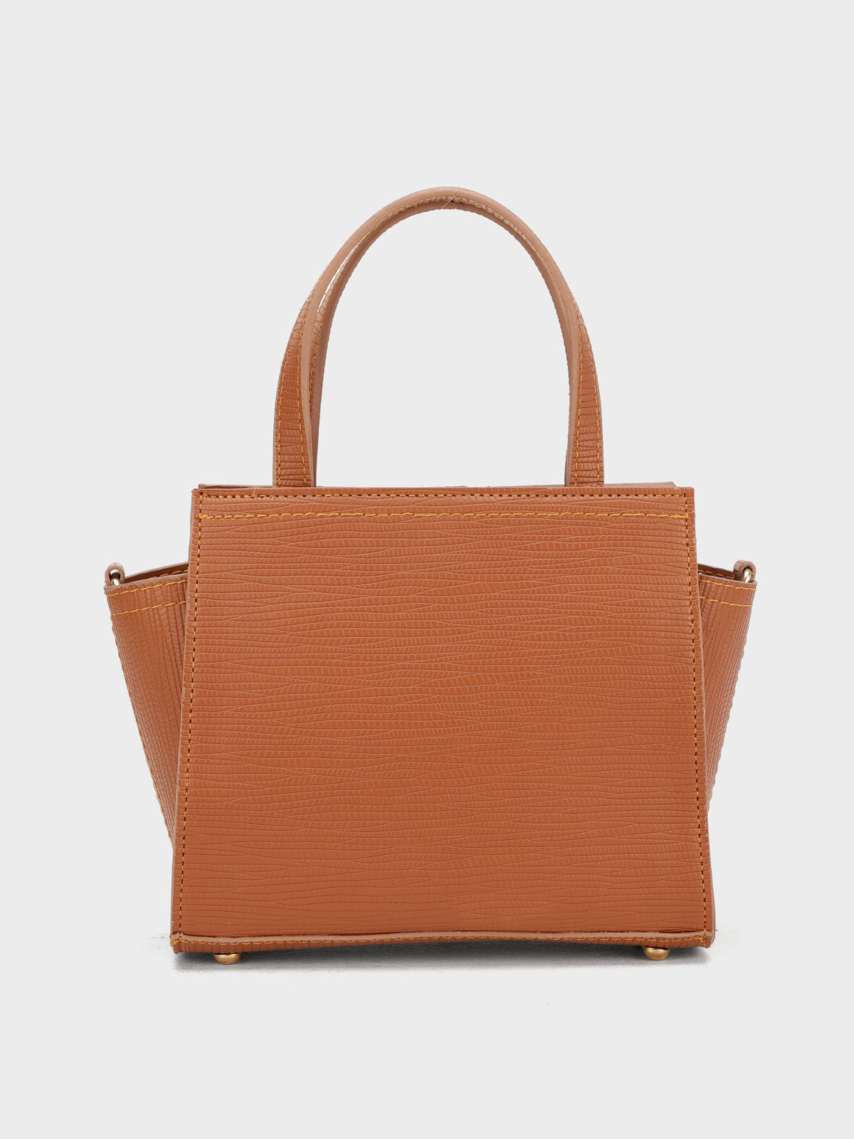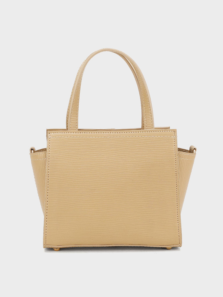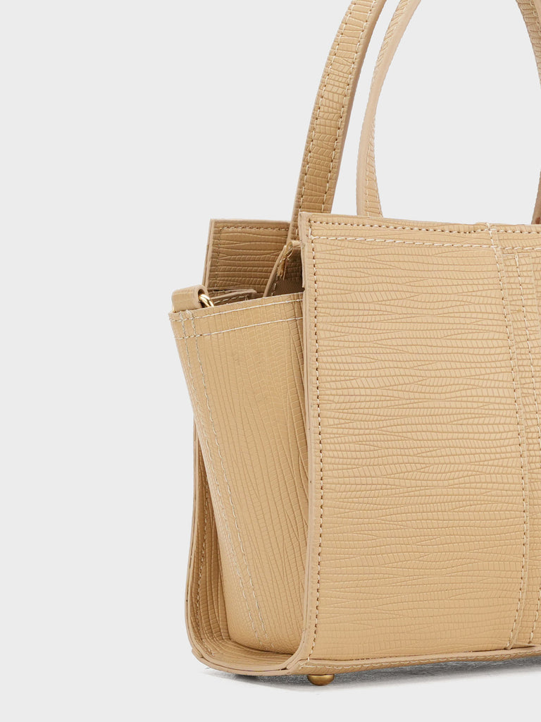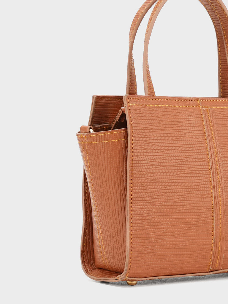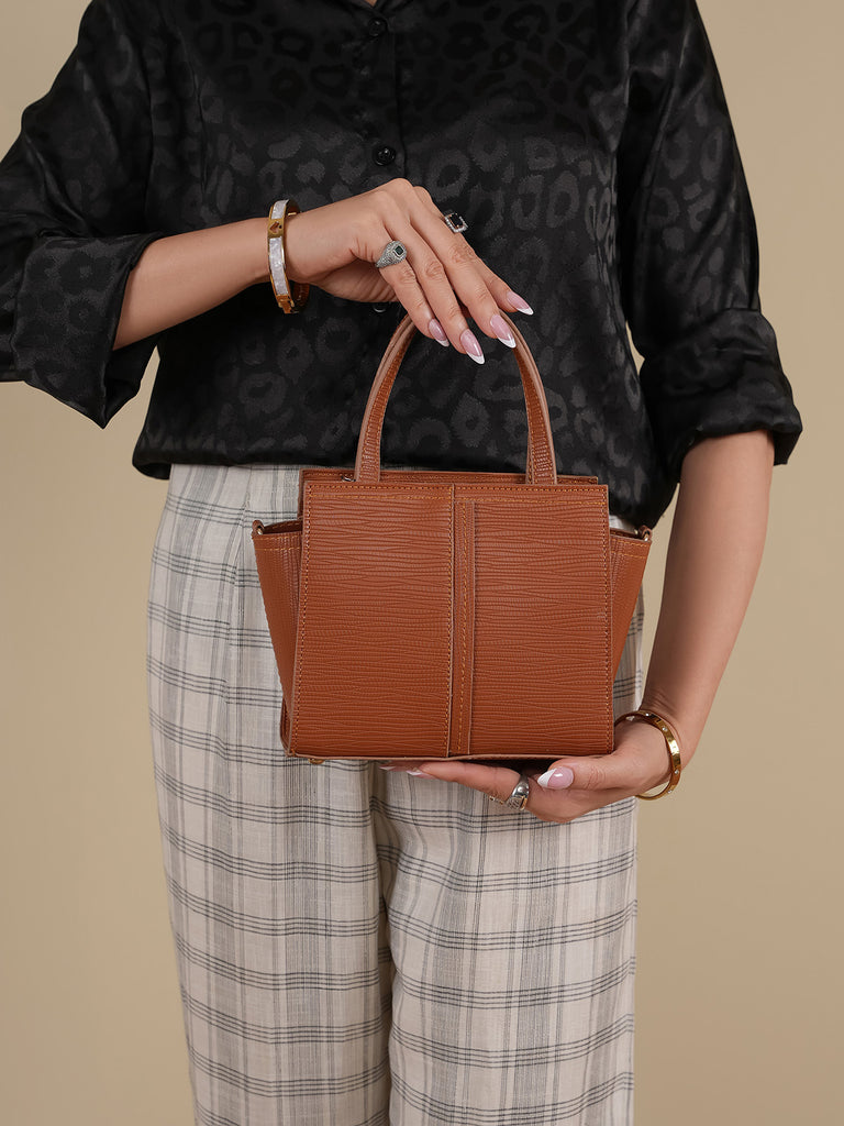 This elegant tan handbag features a textured leather finish with a structured, modern design. It includes dual top handles and flared side panels for added style and functionality. Perfect for both casual and formal occasions.