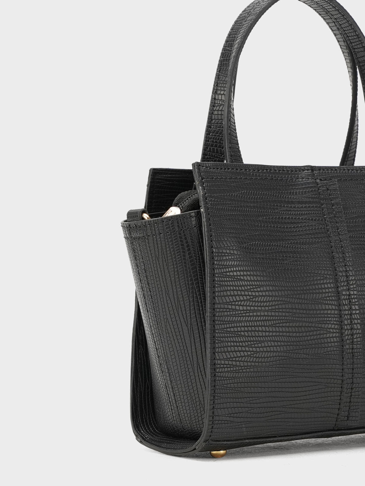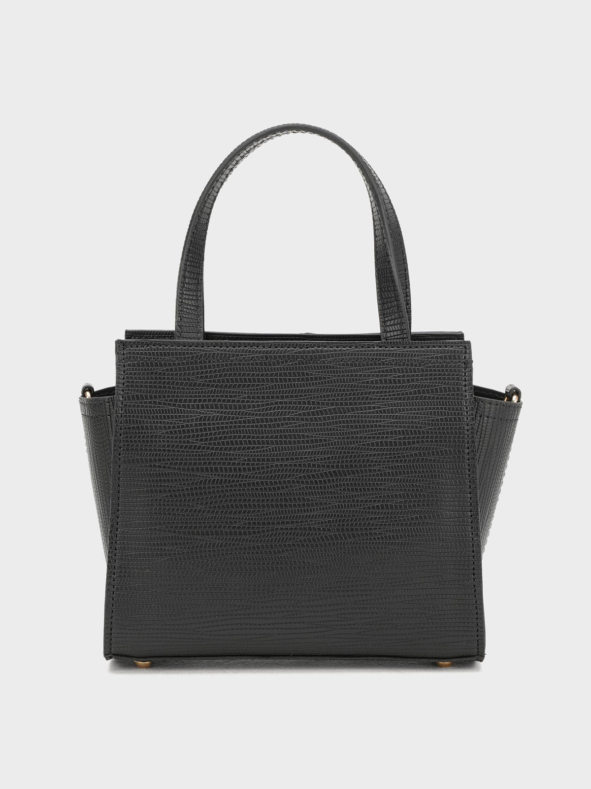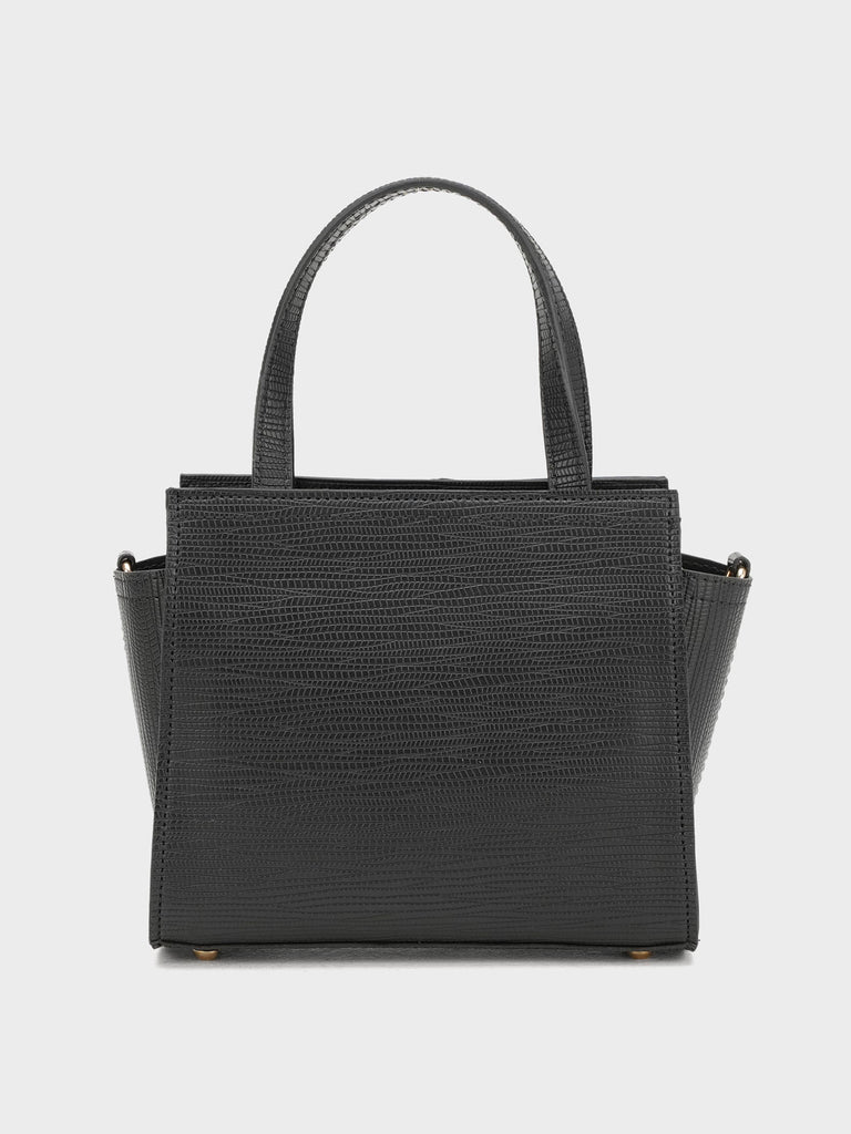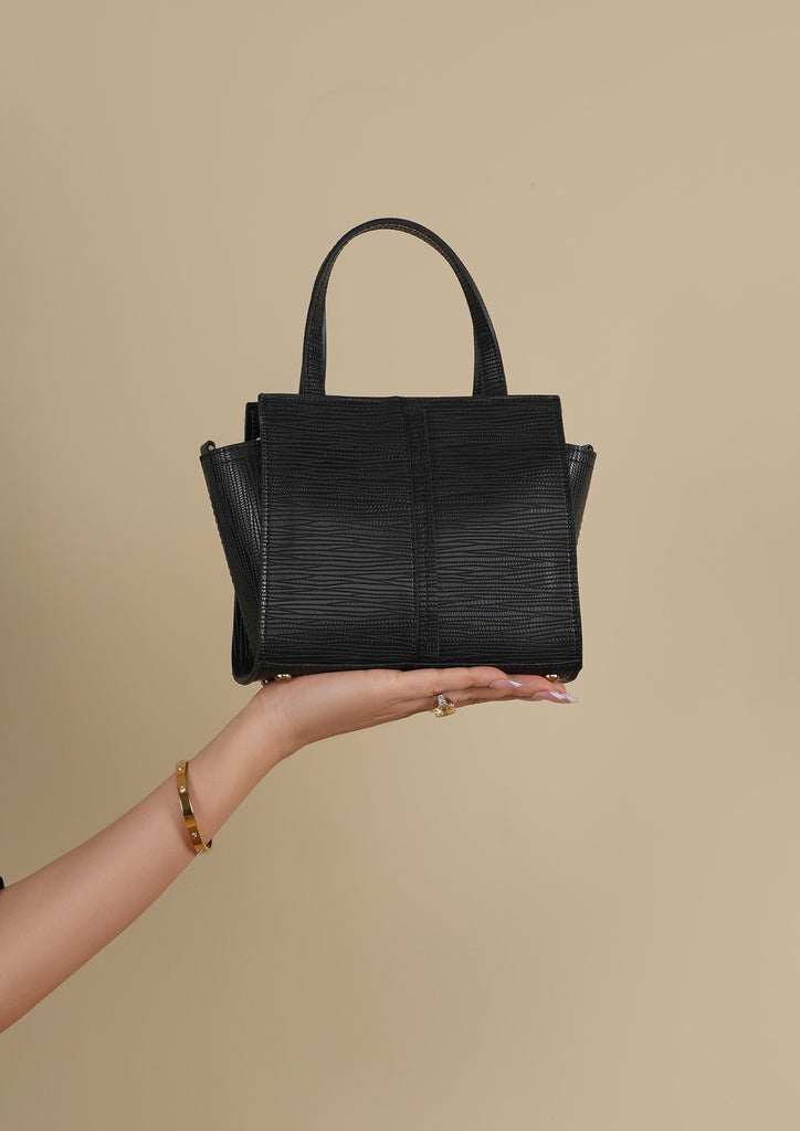 This elegant tan handbag features a textured leather finish with a structured, modern design. It includes dual top handles and flared side panels for added style and functionality. Perfect for both casual and formal occasions.
