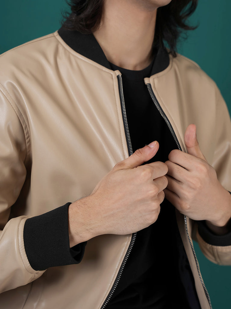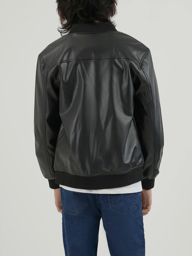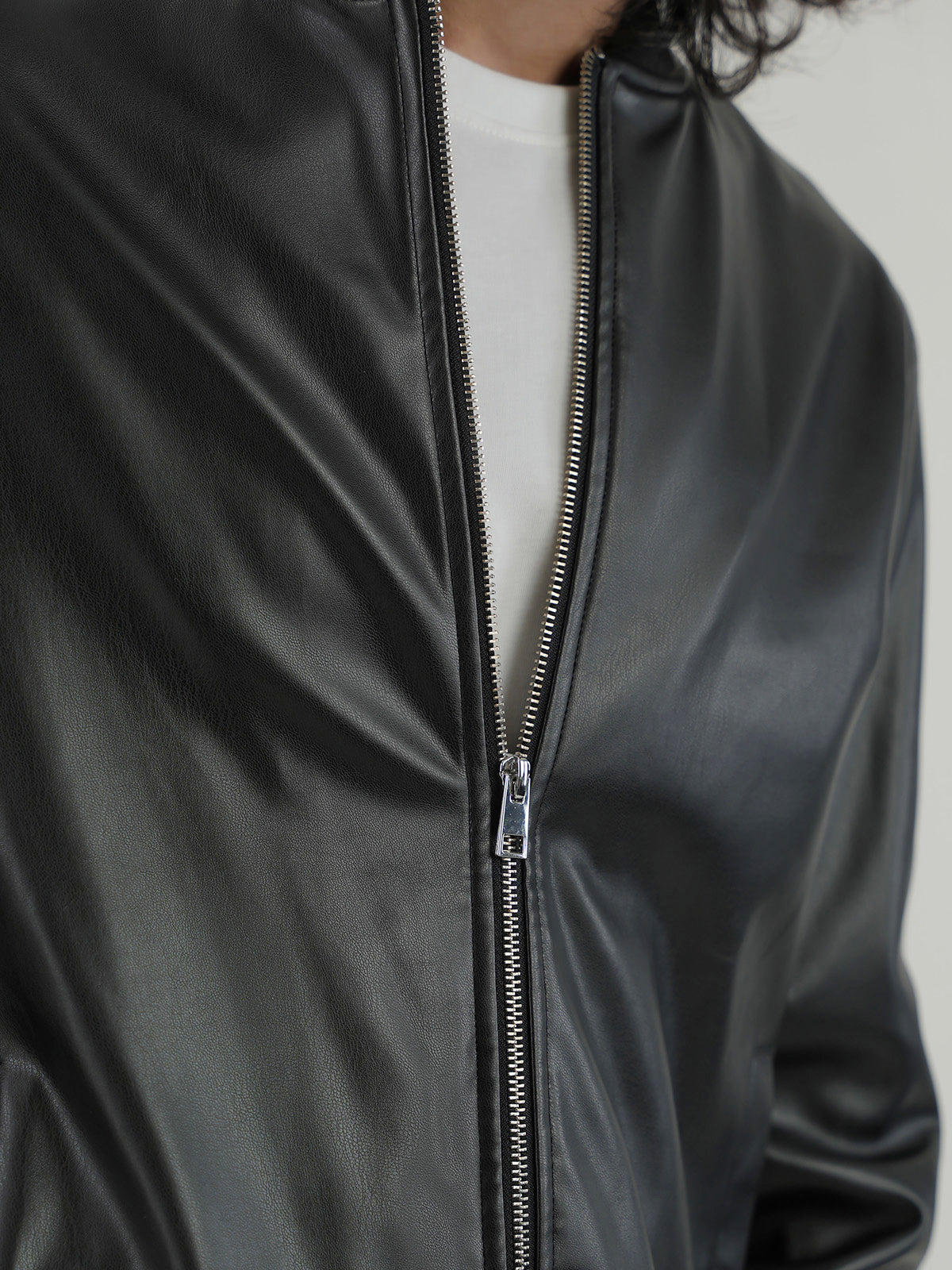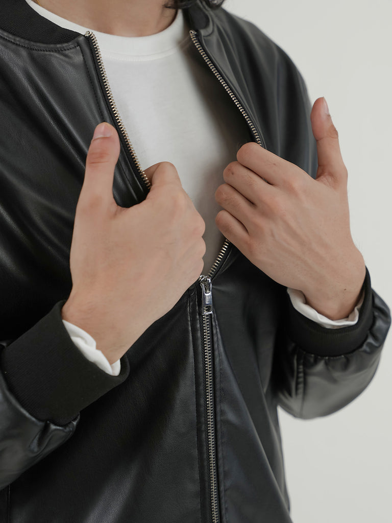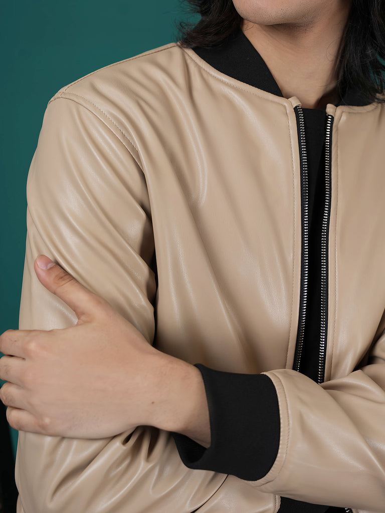 Elevate your casual style with this PU bomber jacket, crafted for a modern yet timeless look. The regular fit ensures comfort, while the sleek faux leather finish adds a bold, fashionable touch to any outfit.