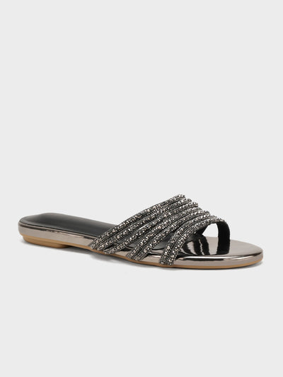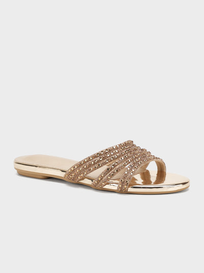 Step into elegance with these chic gold slip-on slippers, featuring a shimmering metallic finish and a series of beaded, crisscross straps for added sparkle and style.