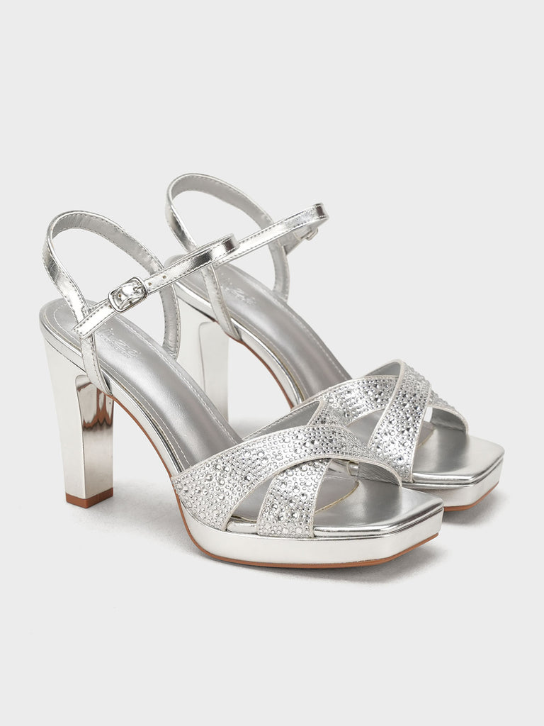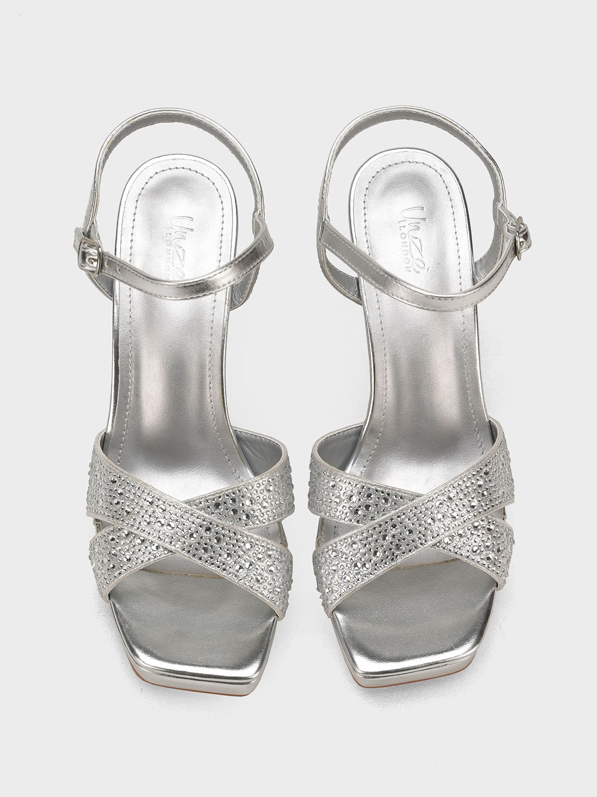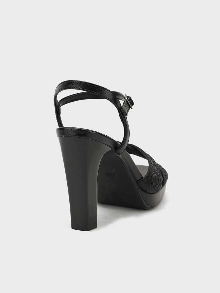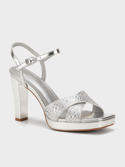 Add a touch of sparkle to your step with these glamorous block heel sandals. Designed with shimmering cross straps and a secure ankle buckle, these heels offer a chic blend of style and comfort. The block heel ensures all-day ease without compromising on fashion.