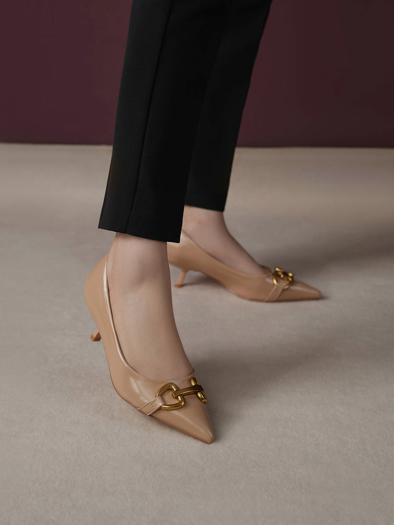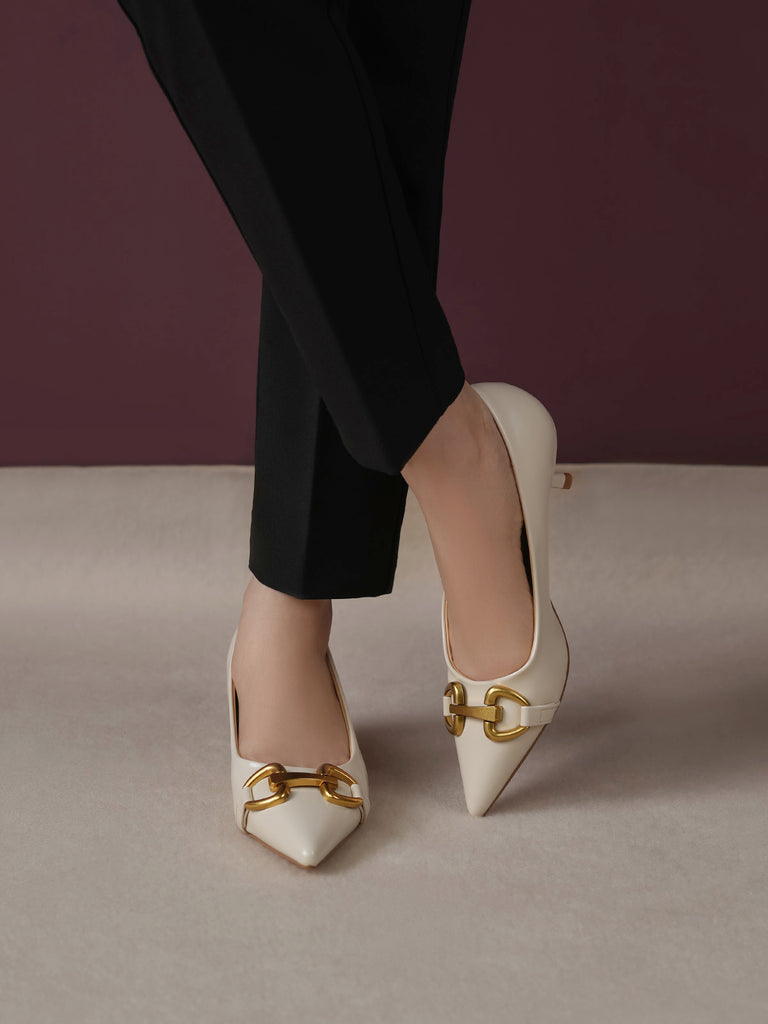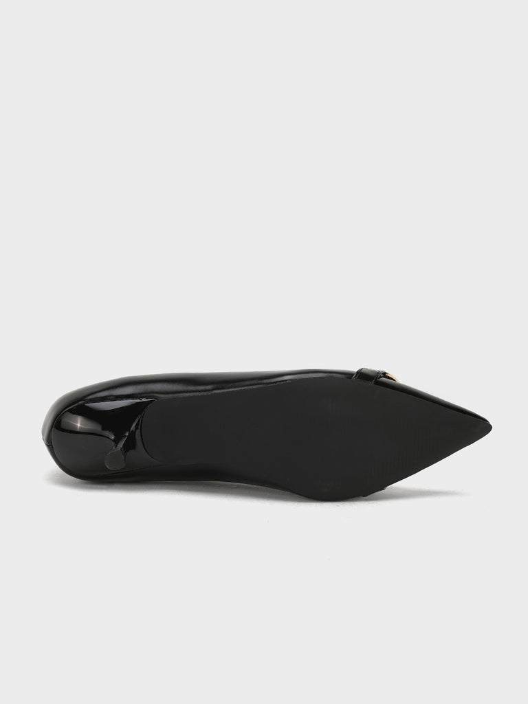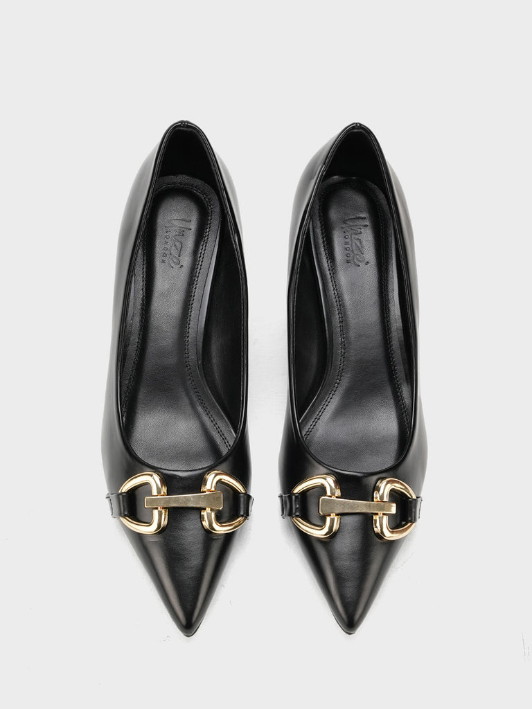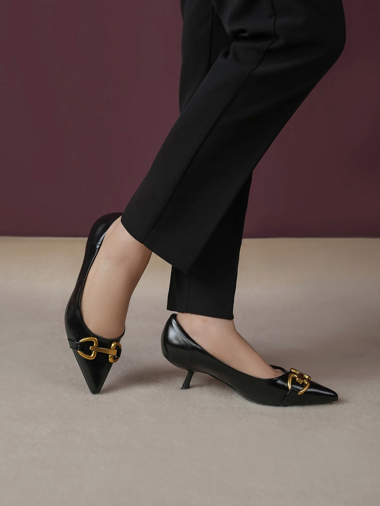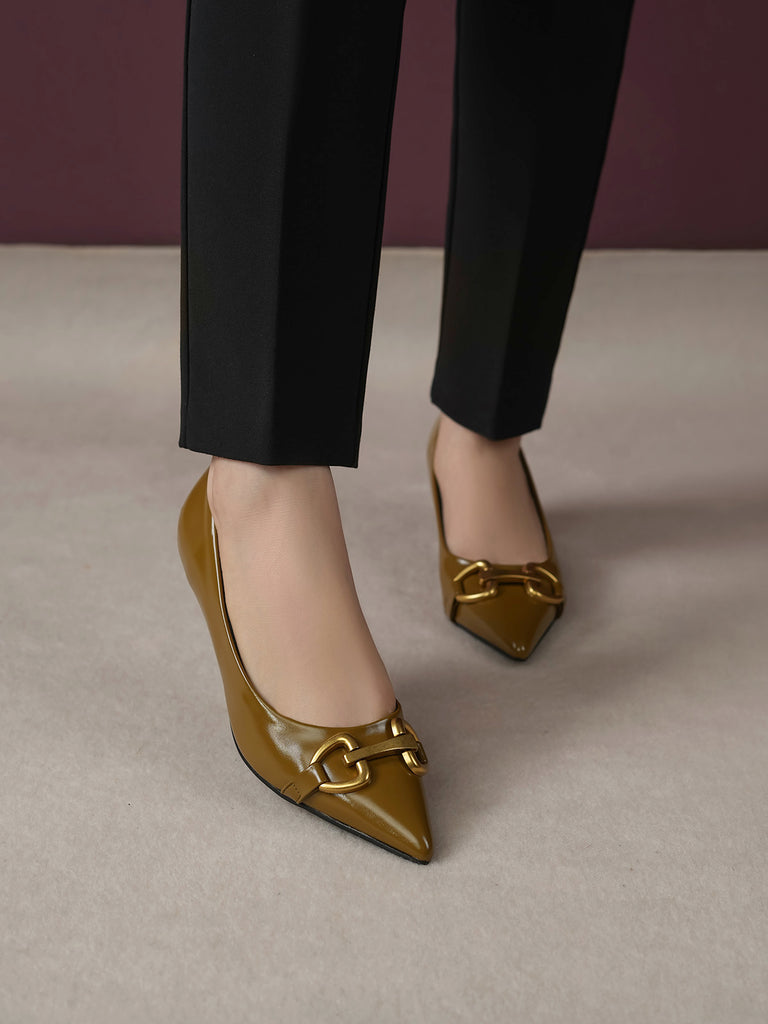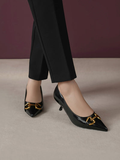 Elevate your style with these elegant pointed-toe court shoes, designed with a glossy finish and bold gold chain detail for a touch of luxury. A timeless design that blends sophistication with modern flair.