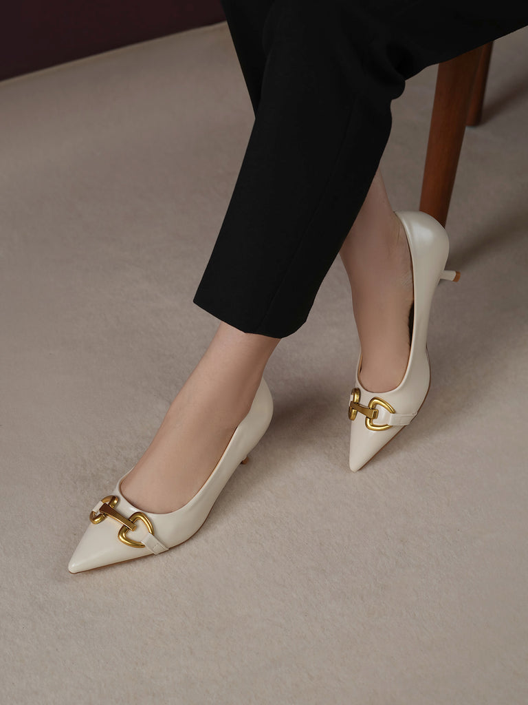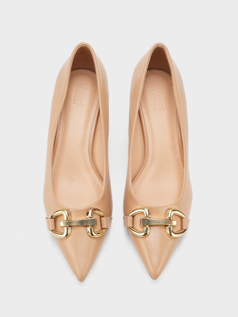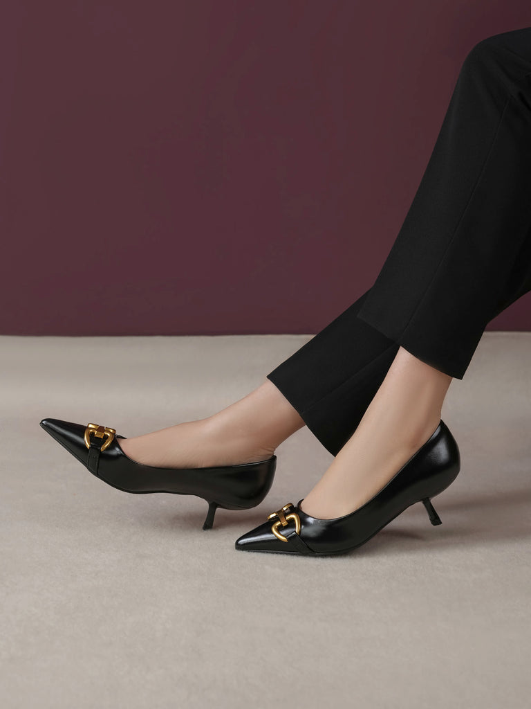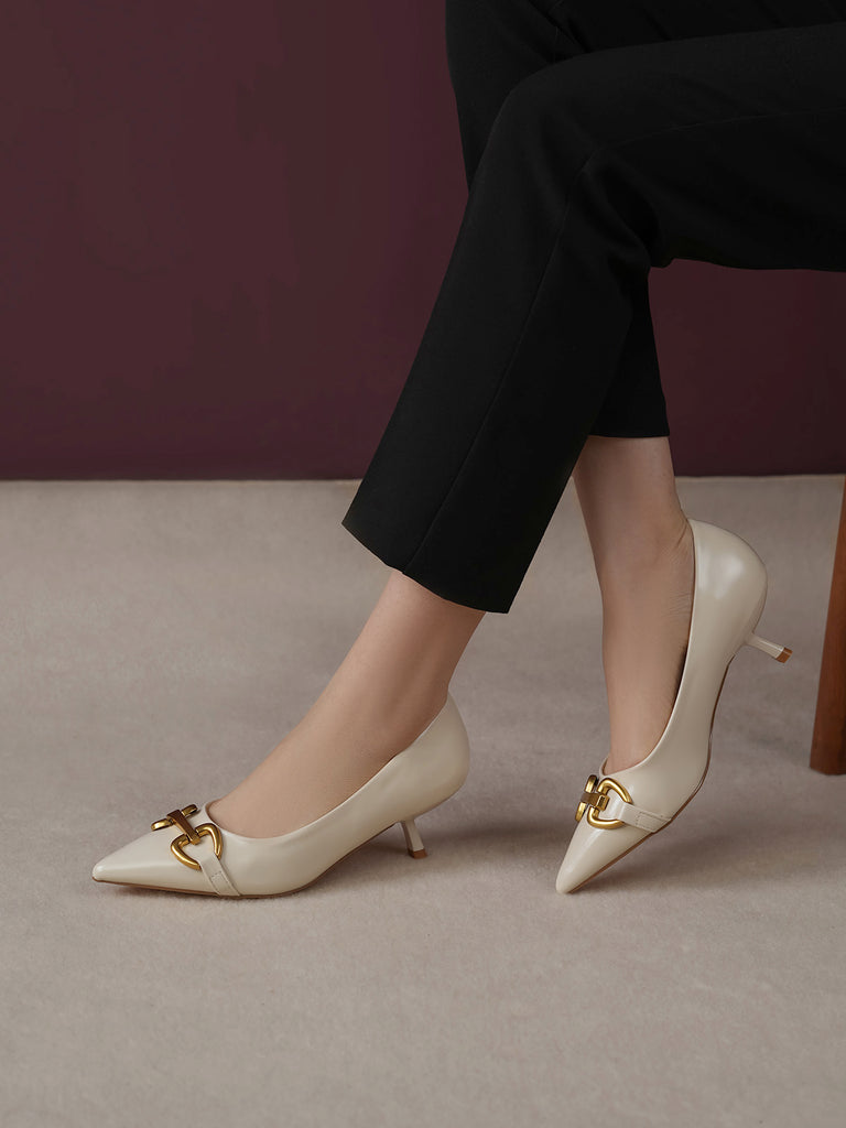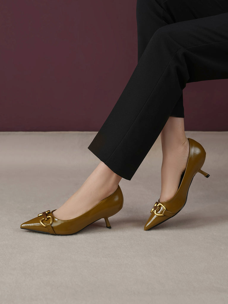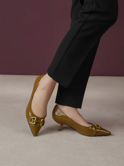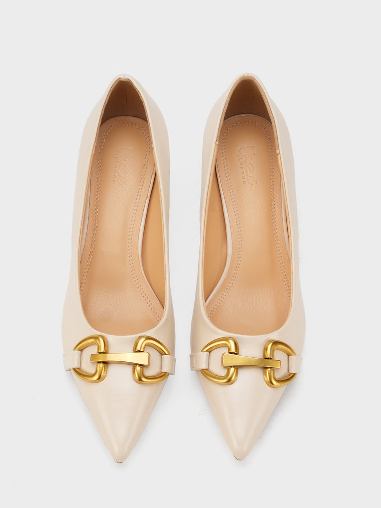 Elevate your style with these elegant pointed-toe court shoes, designed with a glossy finish and bold gold chain detail for a touch of luxury. A timeless design that blends sophistication with modern flair.