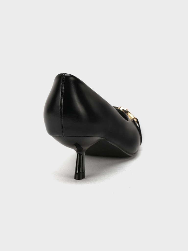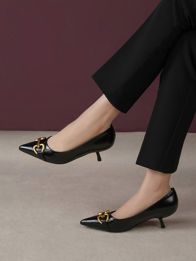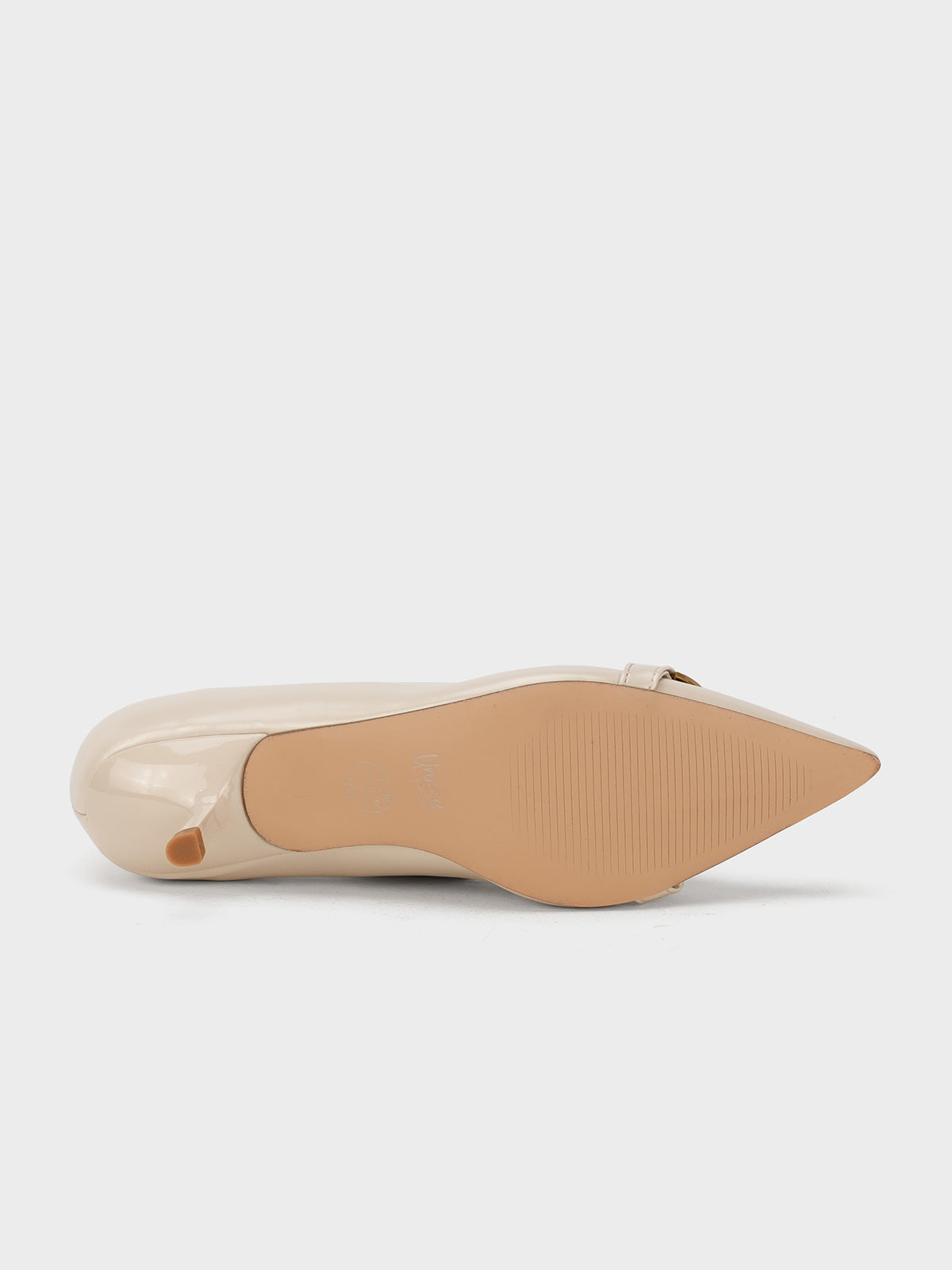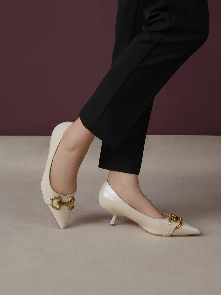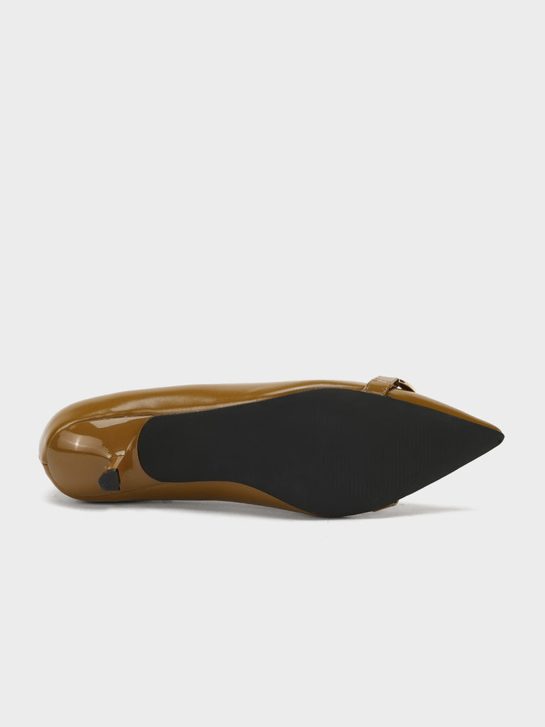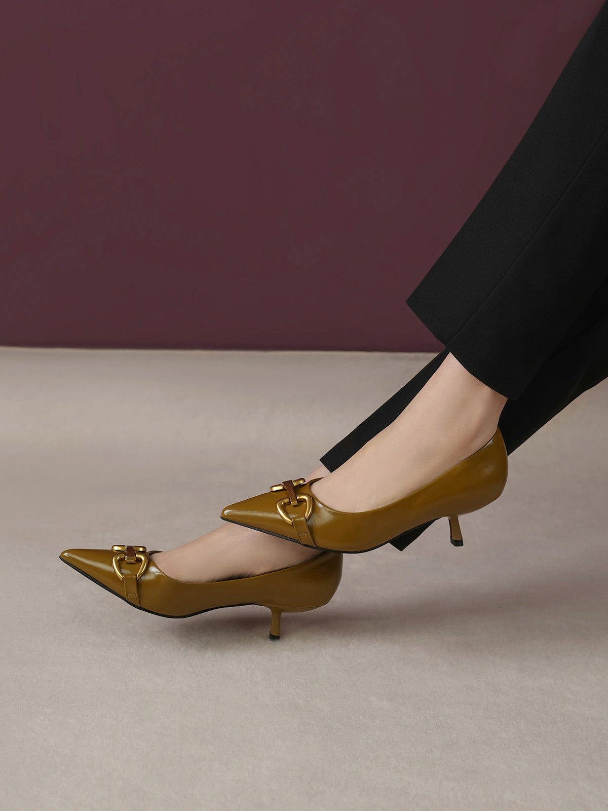 Elevate your style with these elegant pointed-toe court shoes, designed with a glossy finish and bold gold chain detail for a touch of luxury. A timeless design that blends sophistication with modern flair.