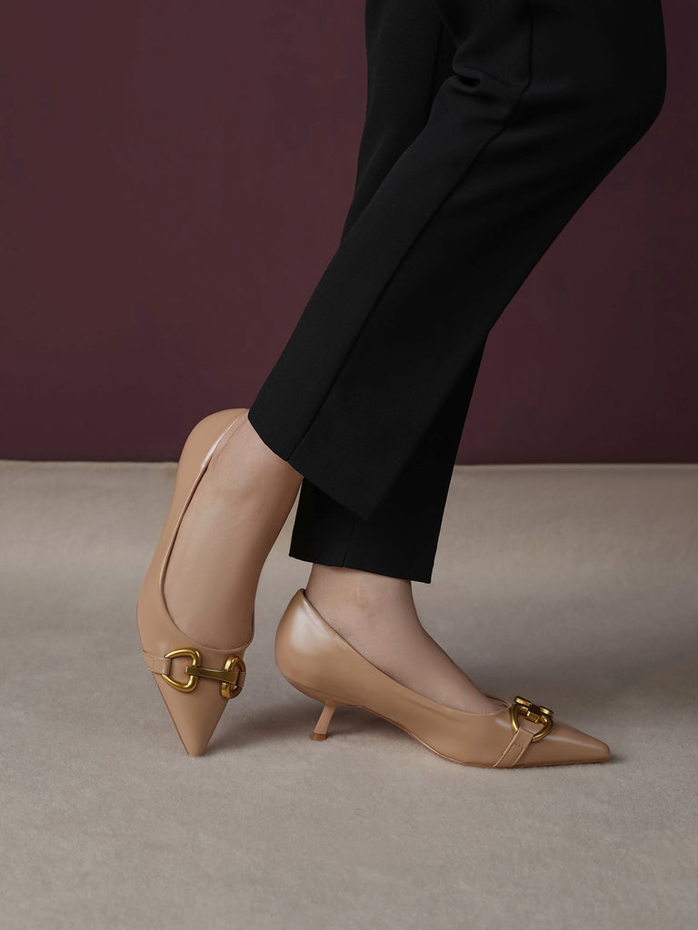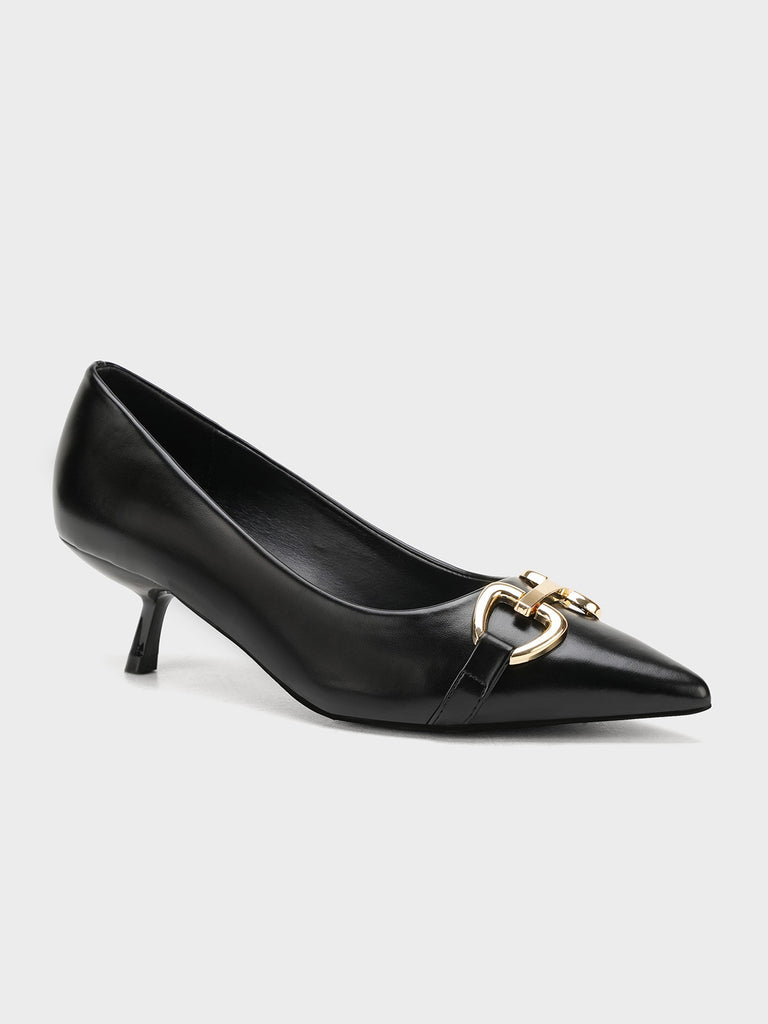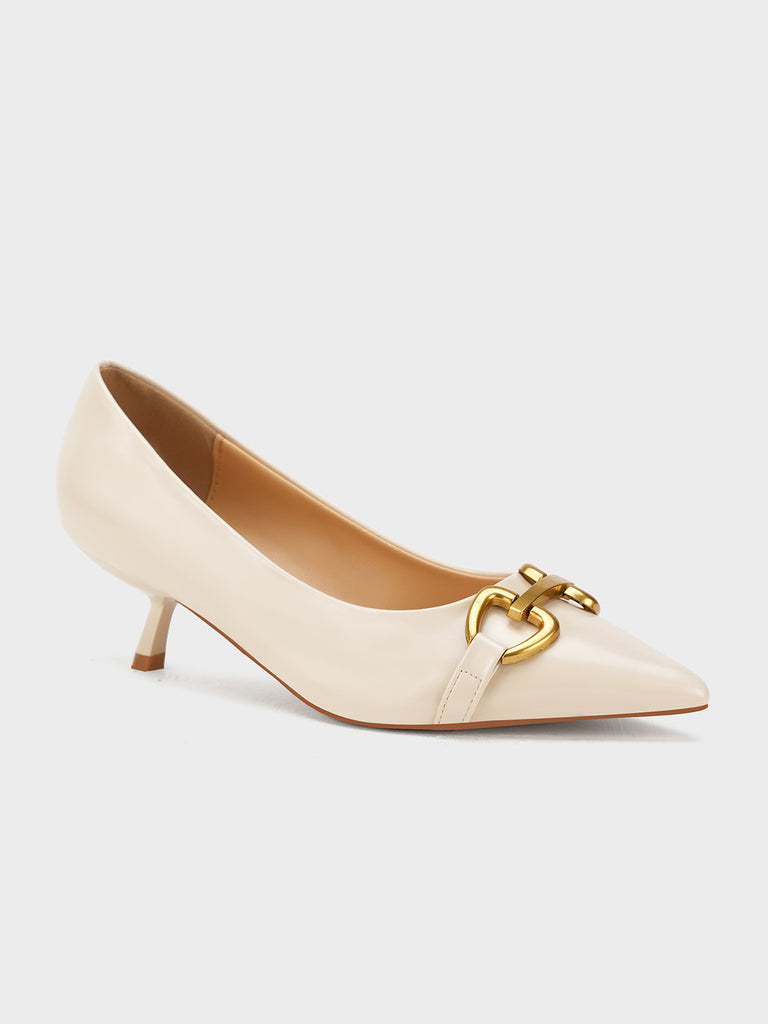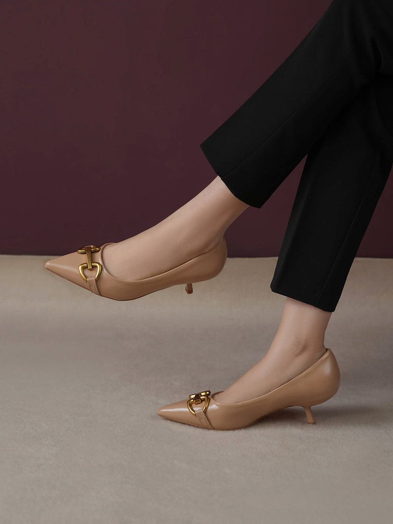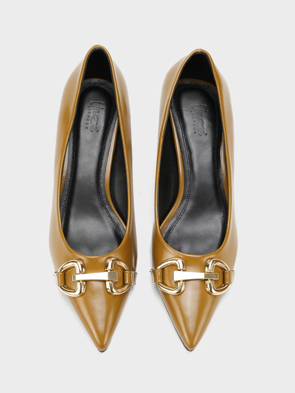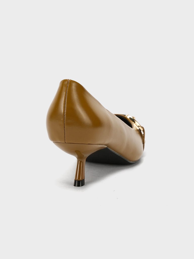 Elevate your style with these elegant pointed-toe court shoes, designed with a glossy finish and bold gold chain detail for a touch of luxury. A timeless design that blends sophistication with modern flair.