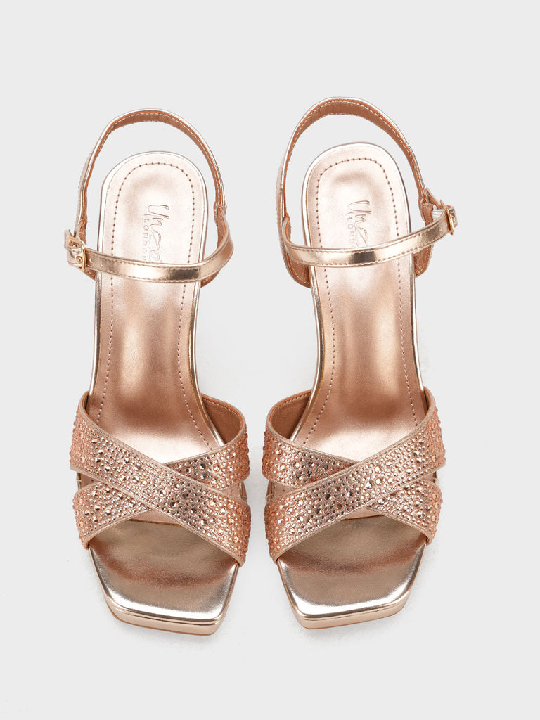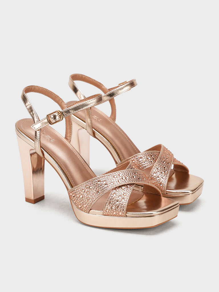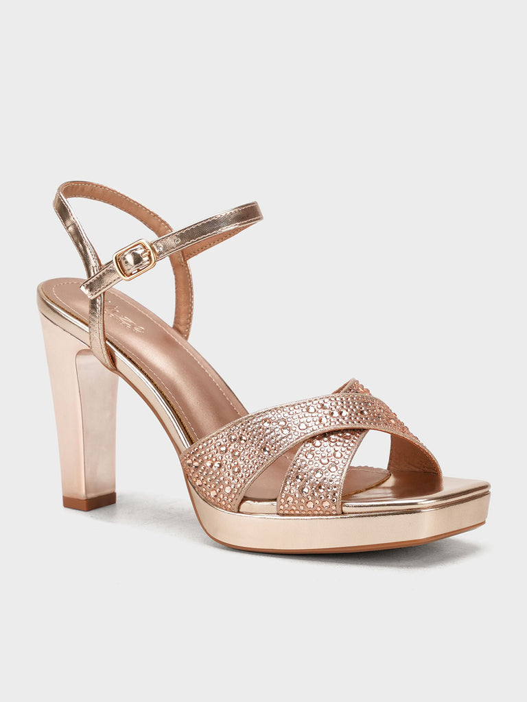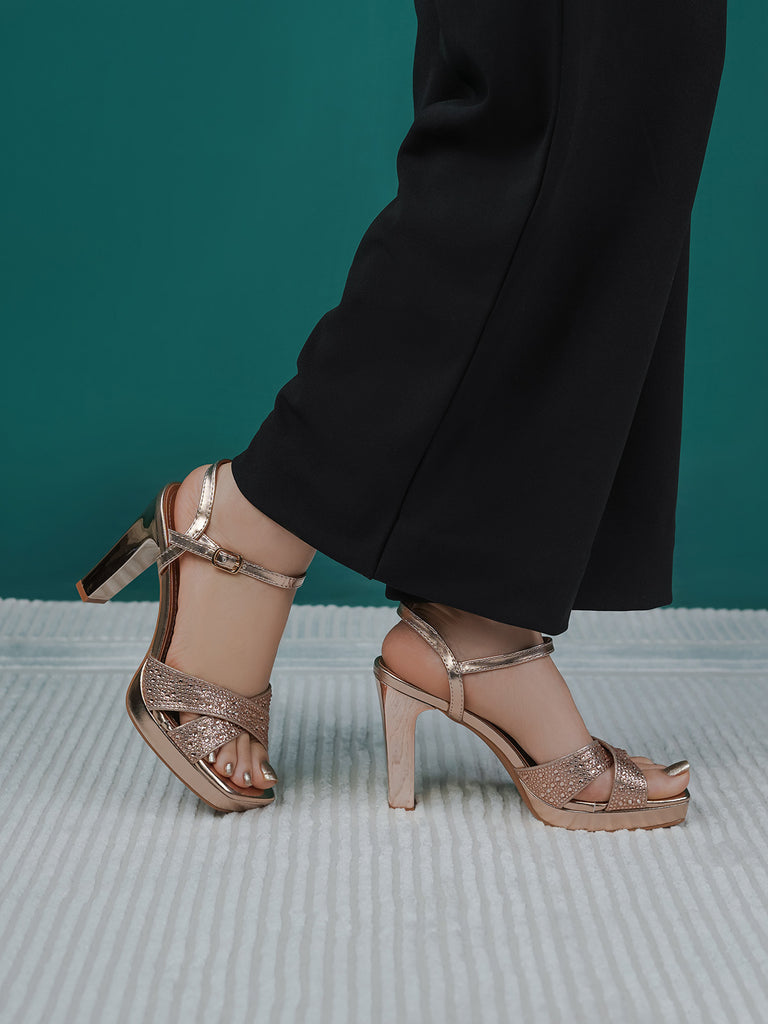 Add a touch of sparkle to your step with these glamorous block heel sandals. Designed with shimmering cross straps and a secure ankle buckle, these heels offer a chic blend of style and comfort. The block heel ensures all-day ease without compromising on fashion.