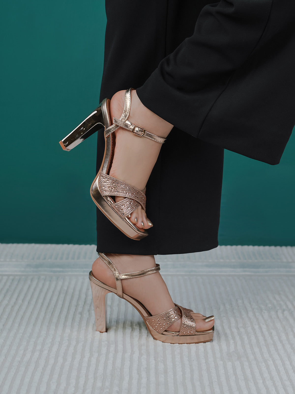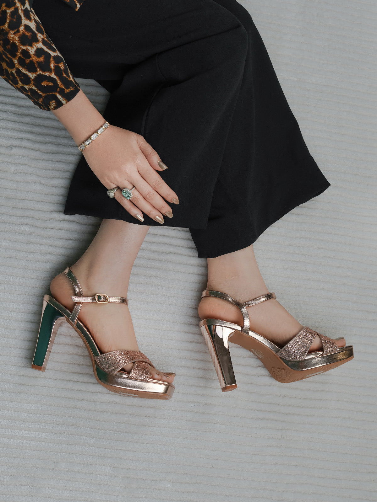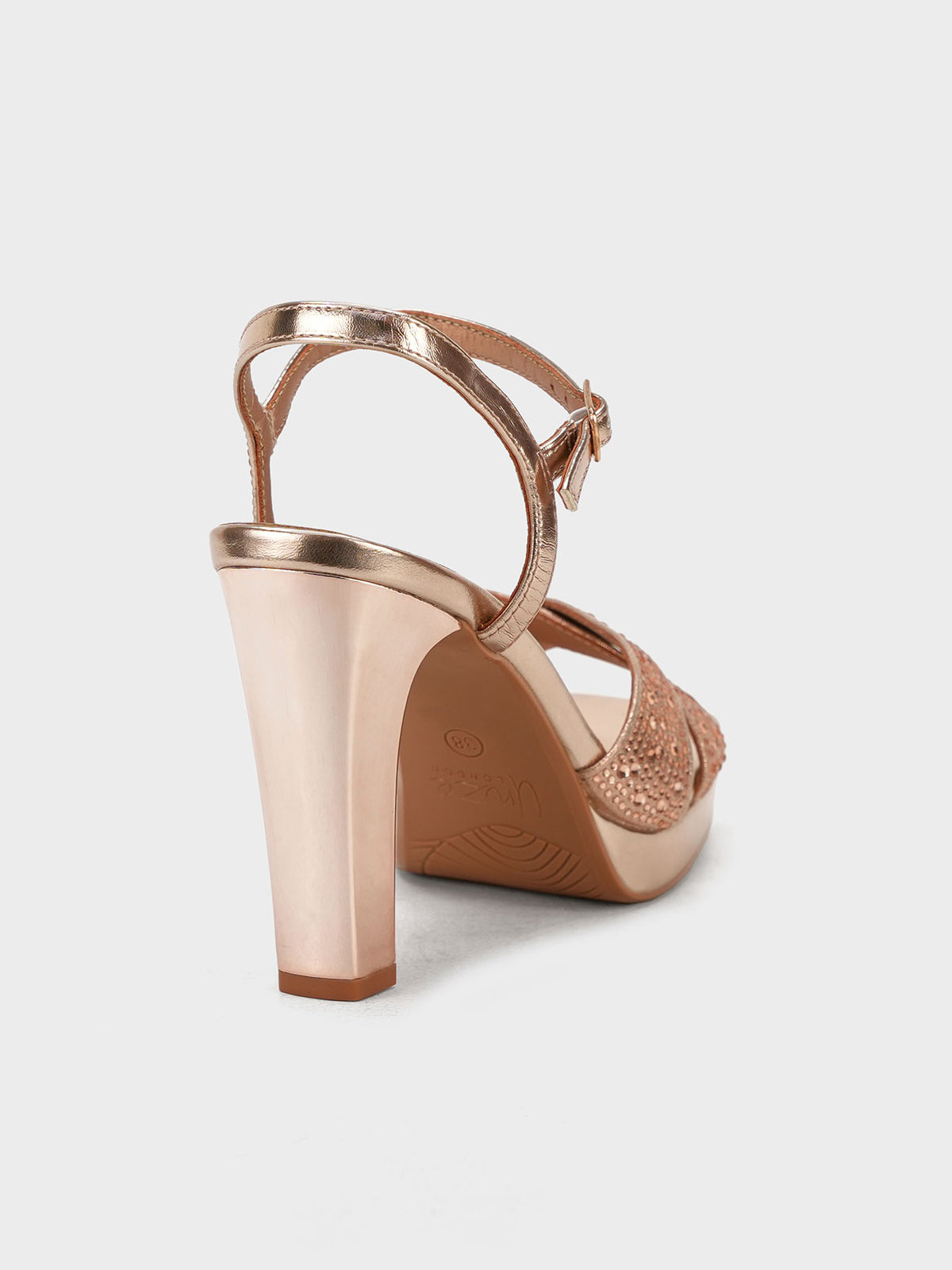 Add a touch of sparkle to your step with these glamorous block heel sandals. Designed with shimmering cross straps and a secure ankle buckle, these heels offer a chic blend of style and comfort. The block heel ensures all-day ease without compromising on fashion.