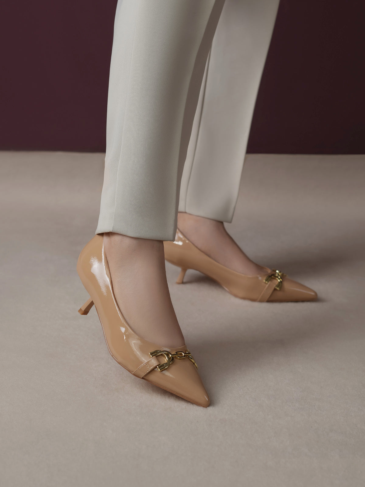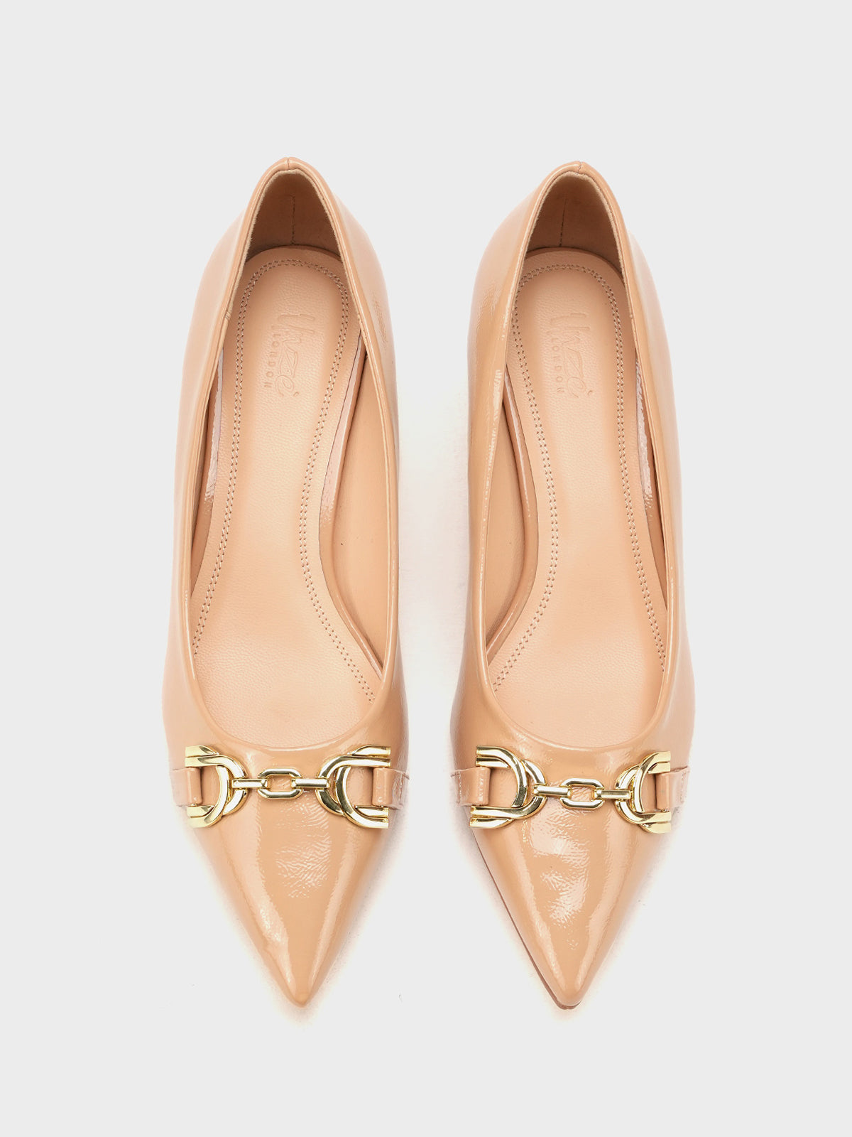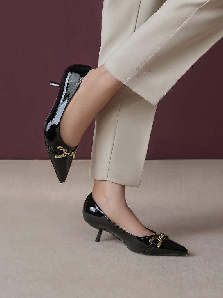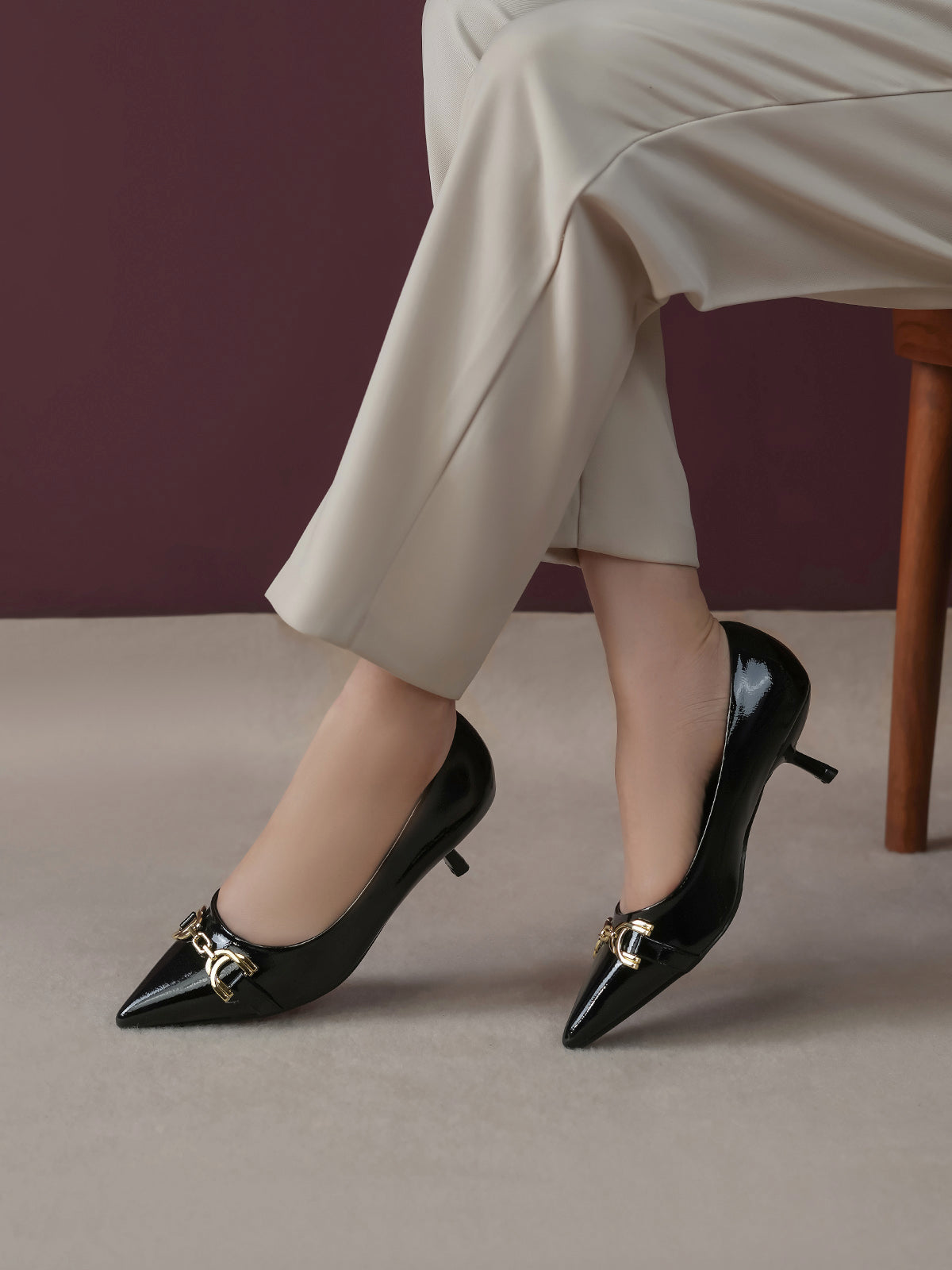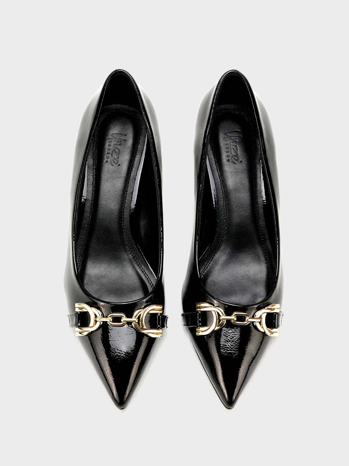 Add a touch of class to your look with these stunning pointed-toe court shoes. Featuring a sleek patent finish and a delicate gold buckle detail, they offer timeless elegance with a modern twist.