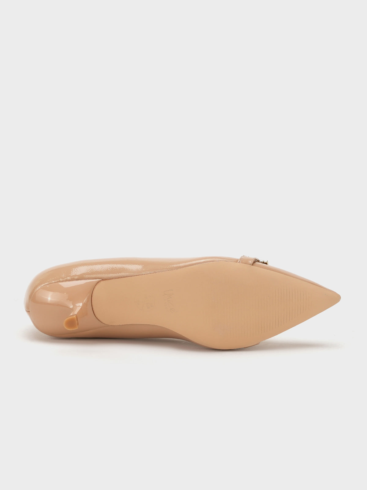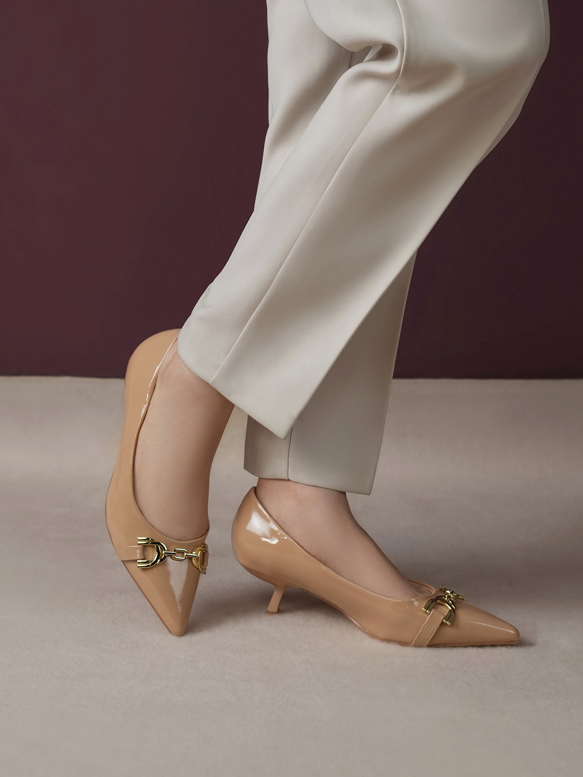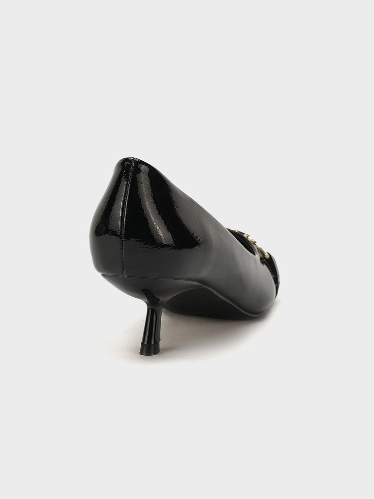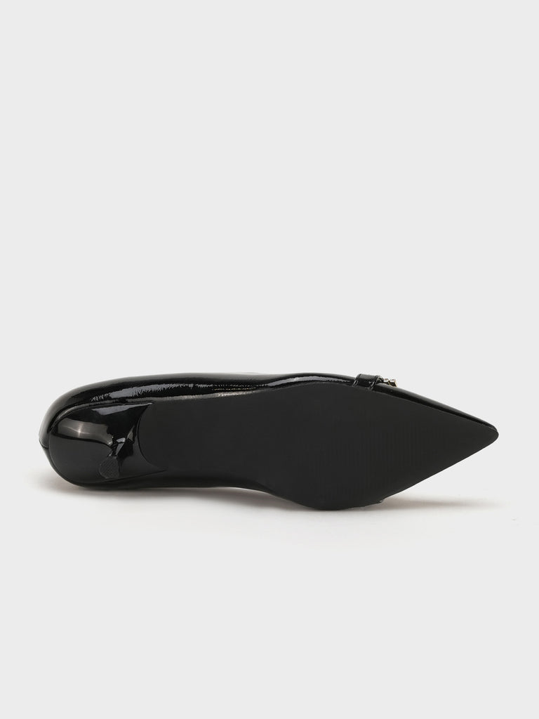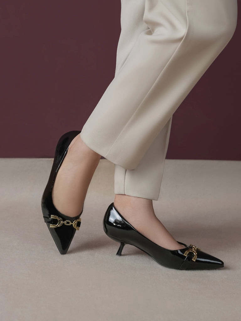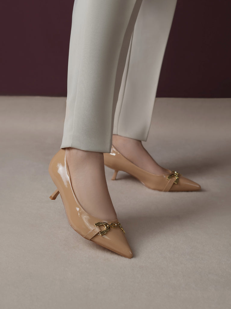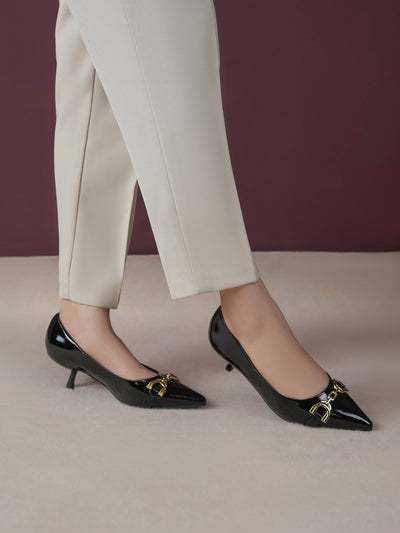 Add a touch of class to your look with these stunning pointed-toe court shoes. Featuring a sleek patent finish and a delicate gold buckle detail, they offer timeless elegance with a modern twist.
