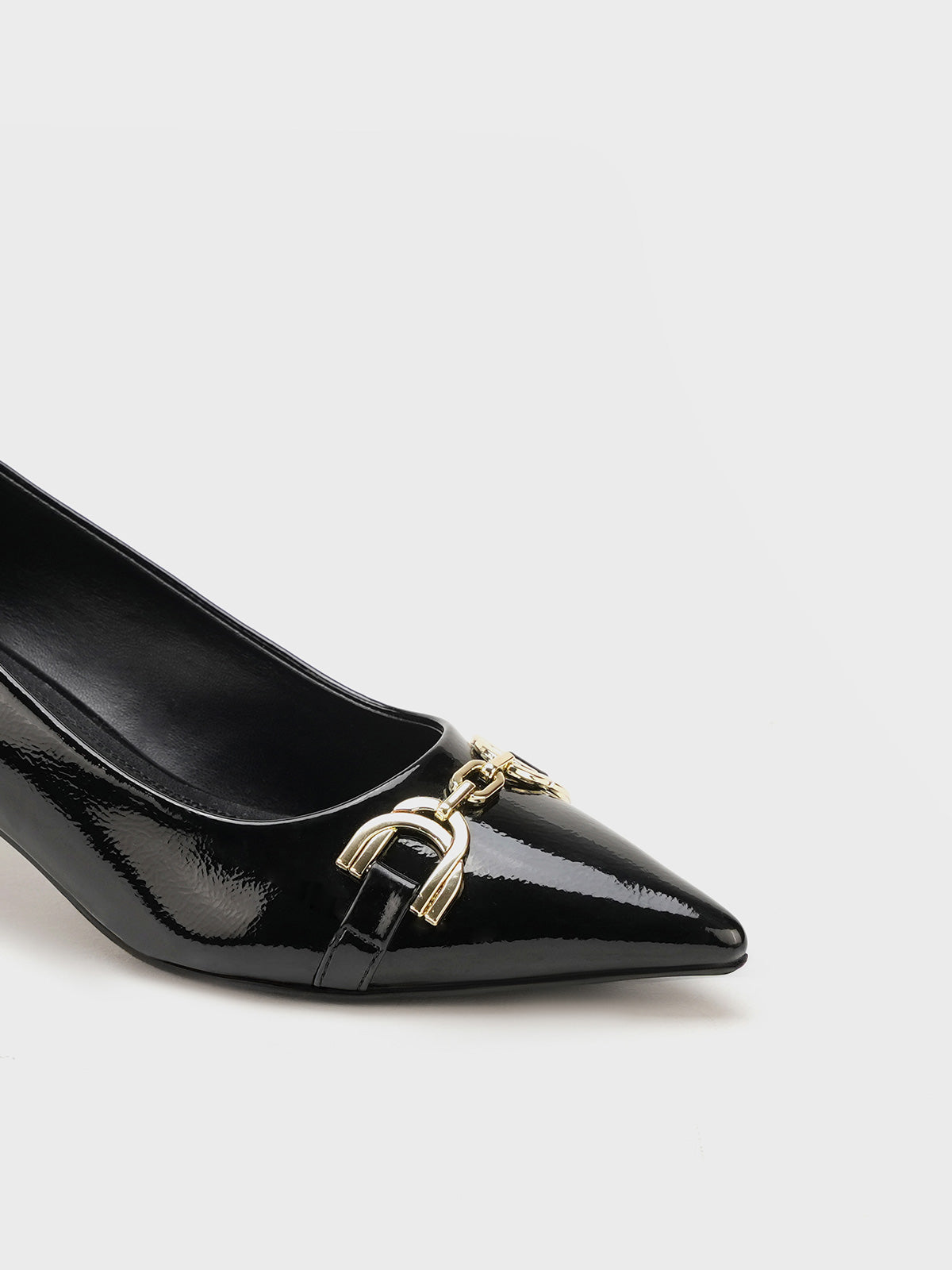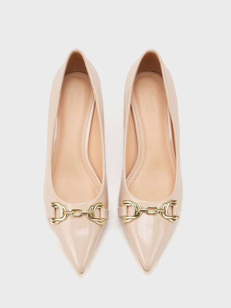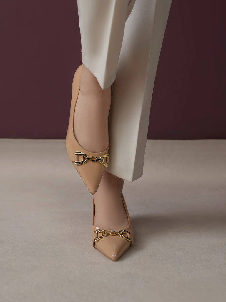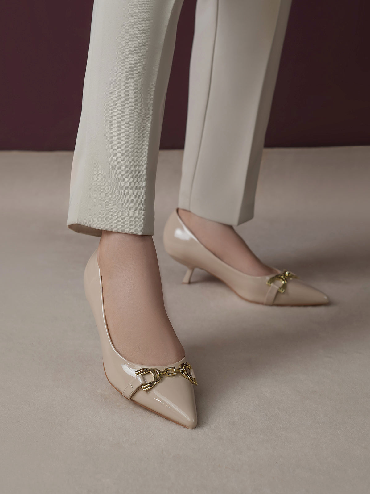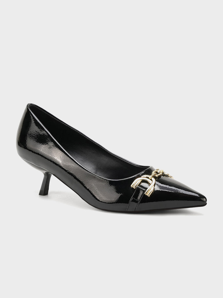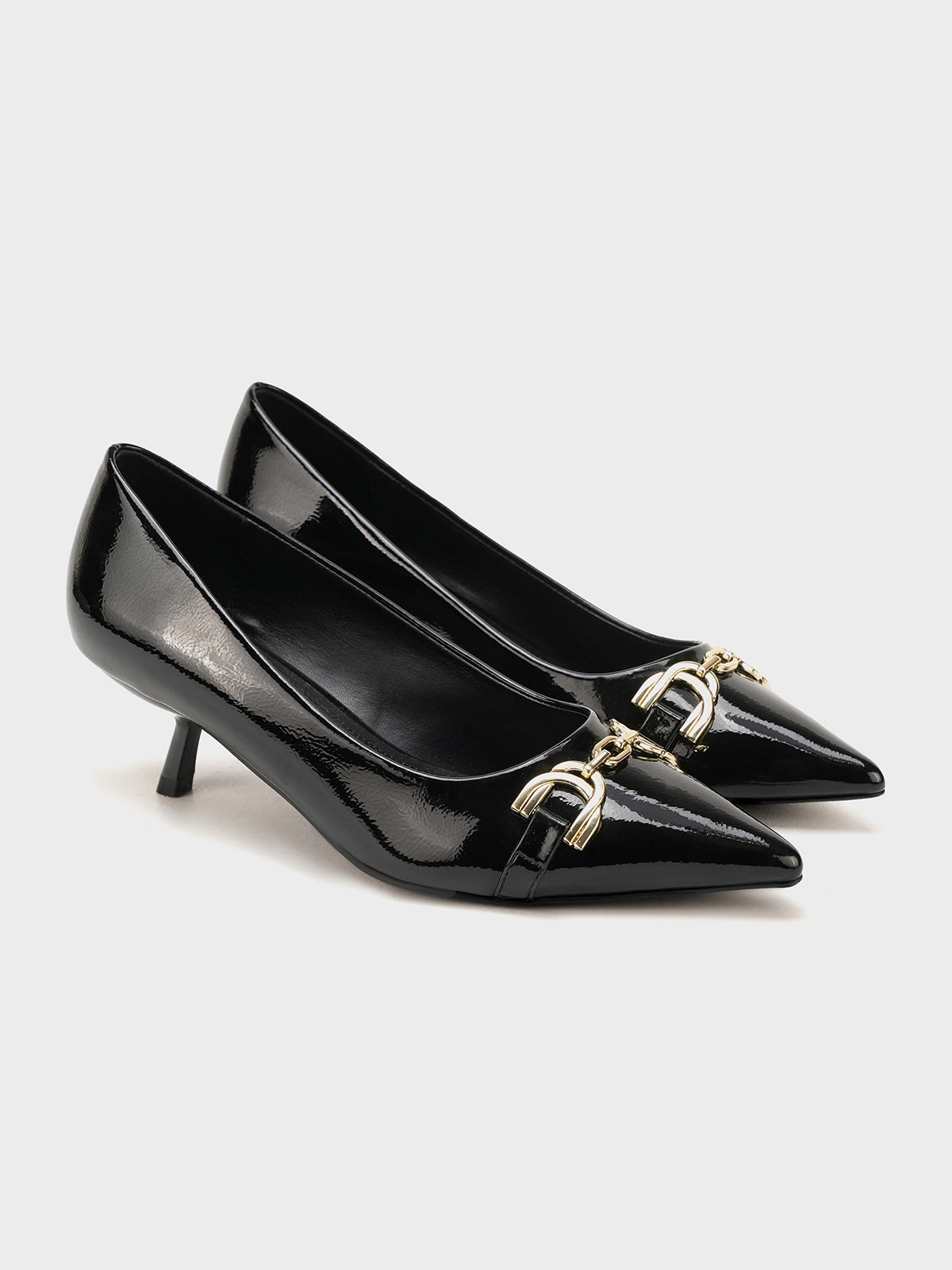 Add a touch of class to your look with these stunning pointed-toe court shoes. Featuring a sleek patent finish and a delicate gold buckle detail, they offer timeless elegance with a modern twist.