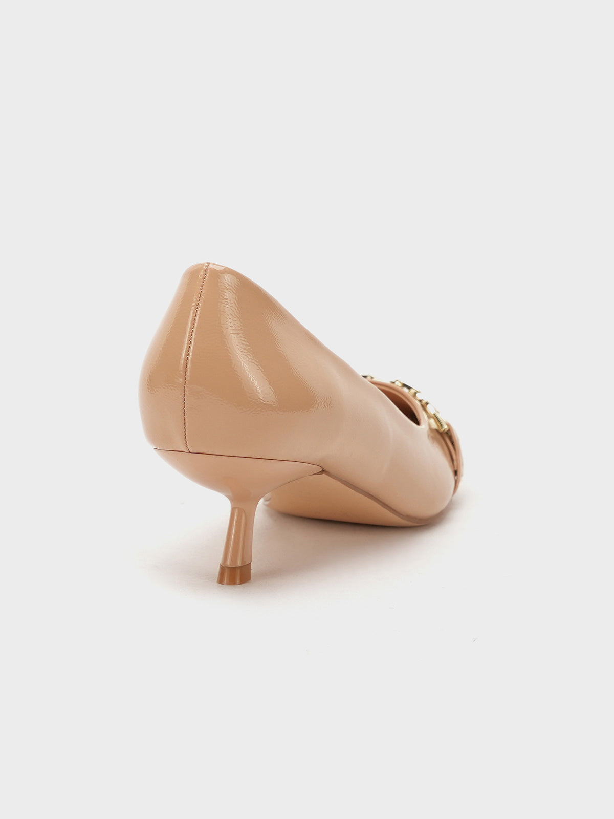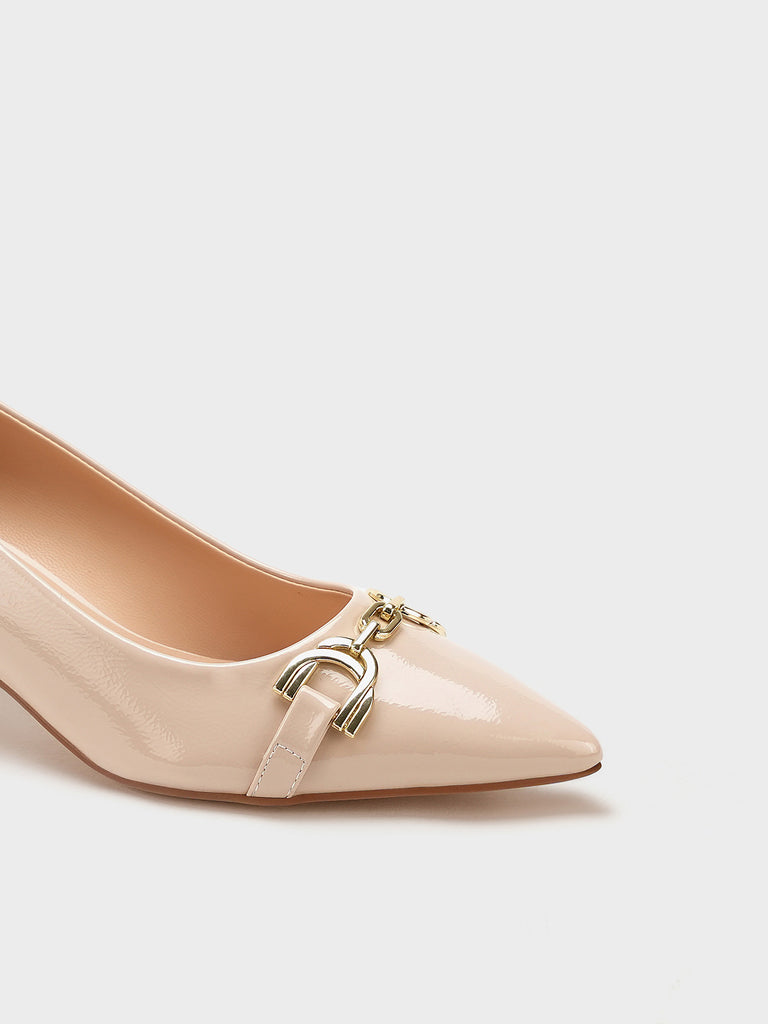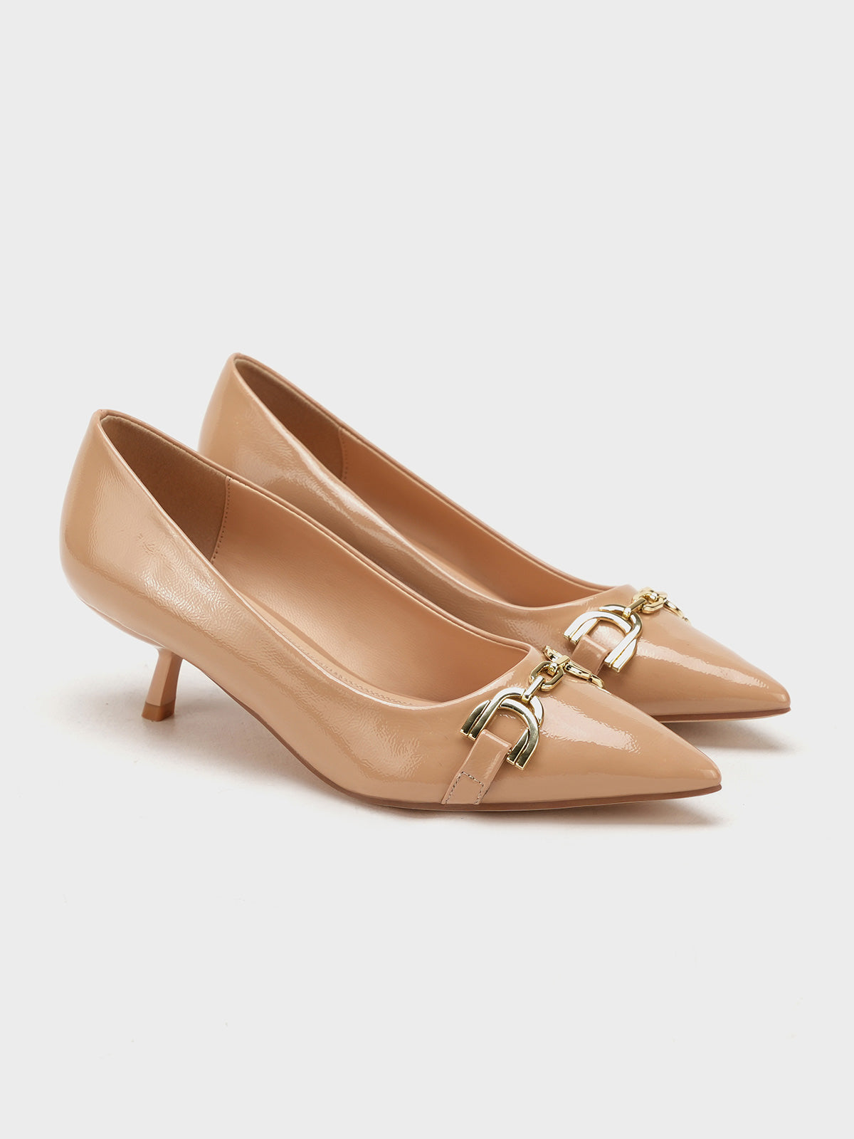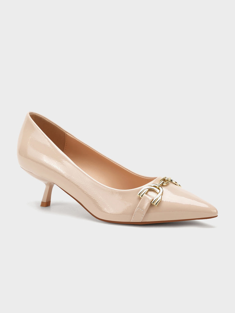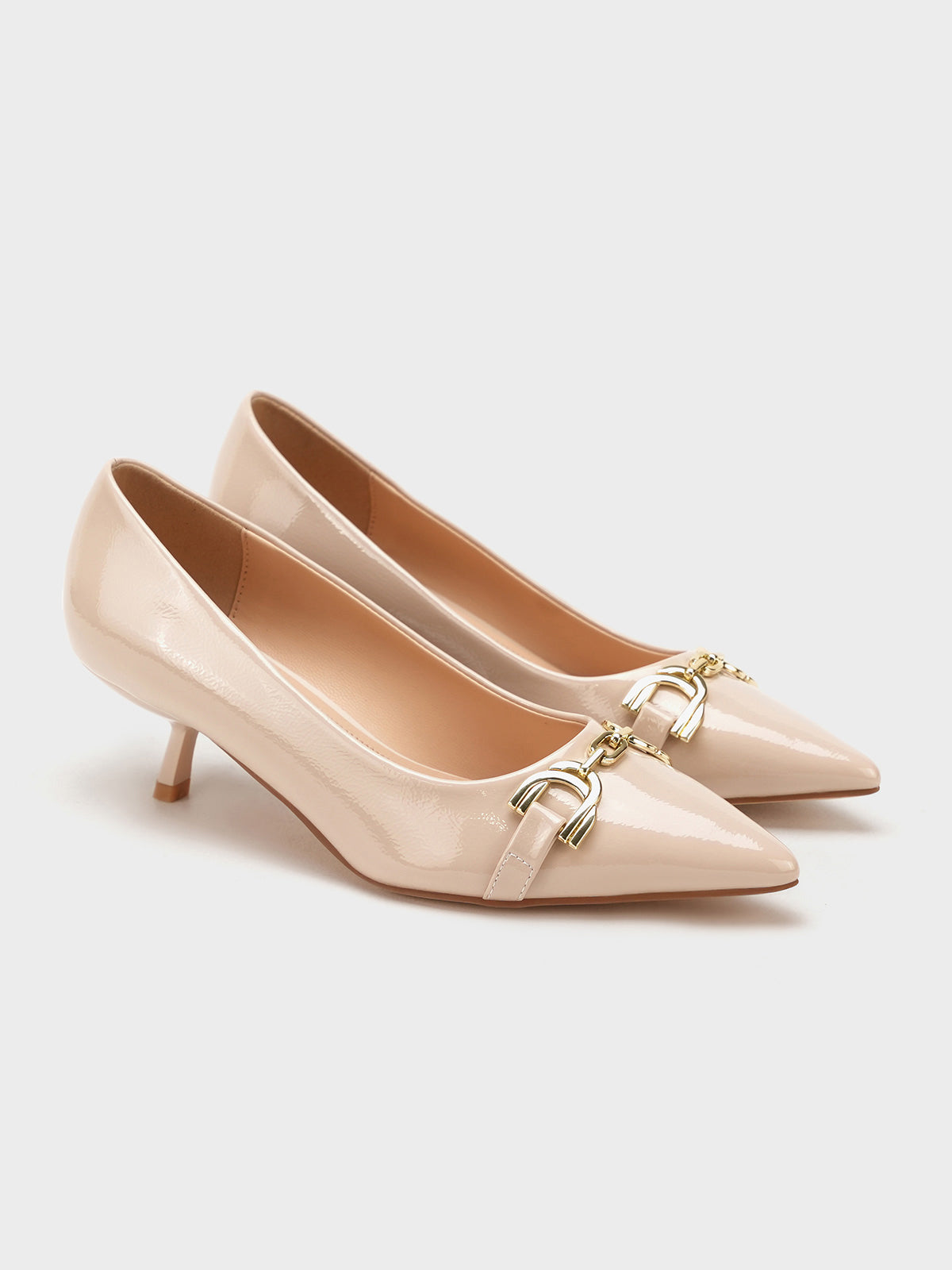 Add a touch of class to your look with these stunning pointed-toe court shoes. Featuring a sleek patent finish and a delicate gold buckle detail, they offer timeless elegance with a modern twist.