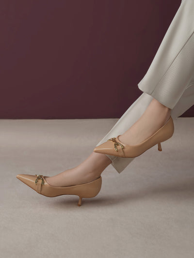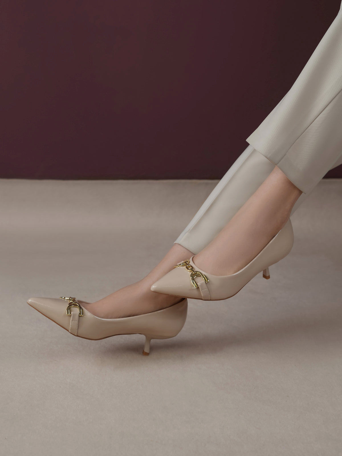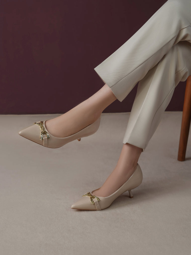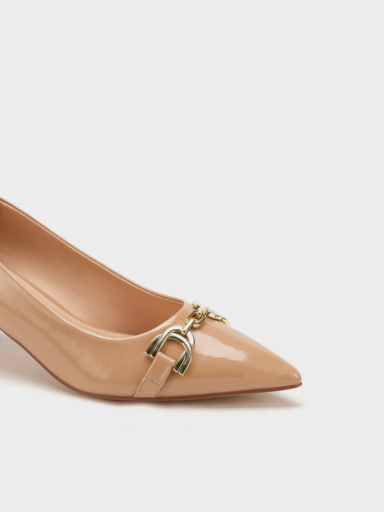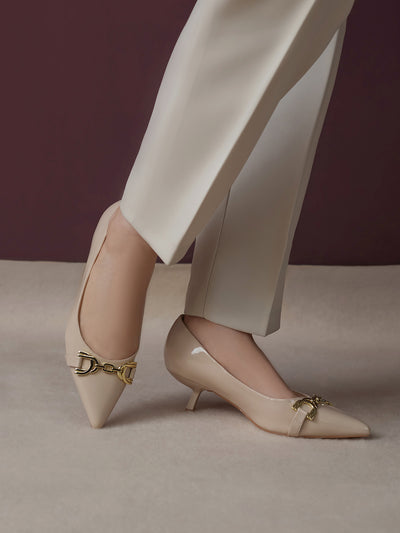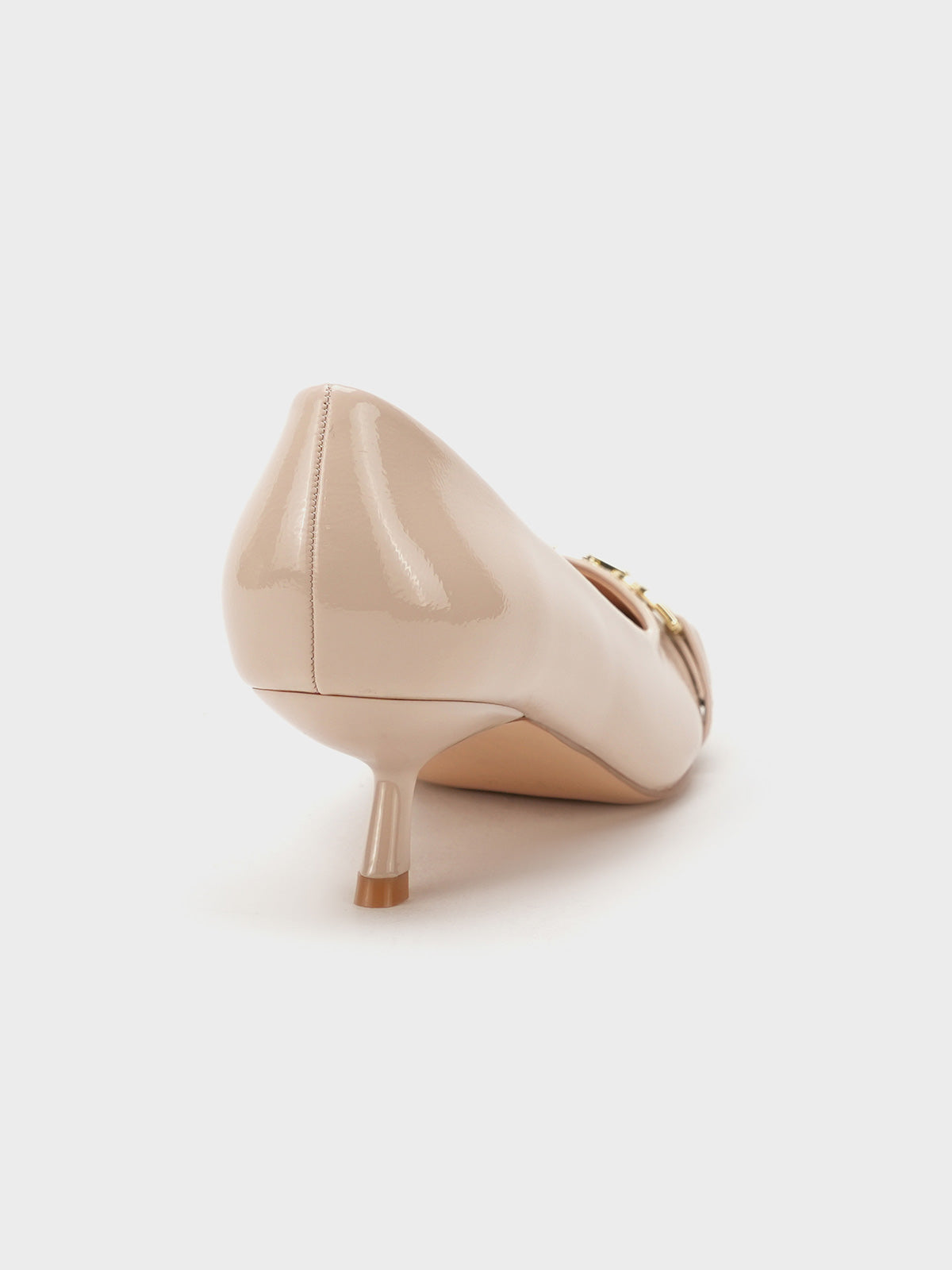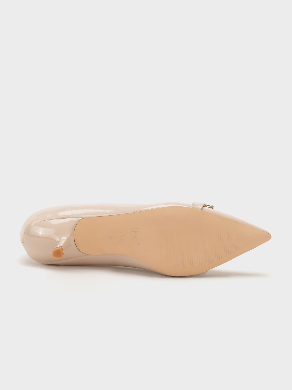 Add a touch of class to your look with these stunning pointed-toe court shoes. Featuring a sleek patent finish and a delicate gold buckle detail, they offer timeless elegance with a modern twist.