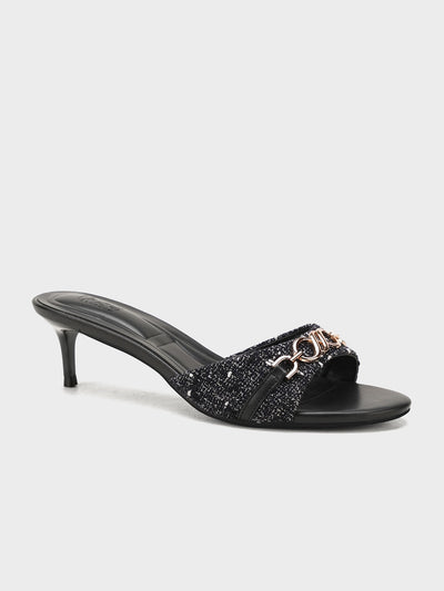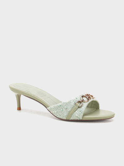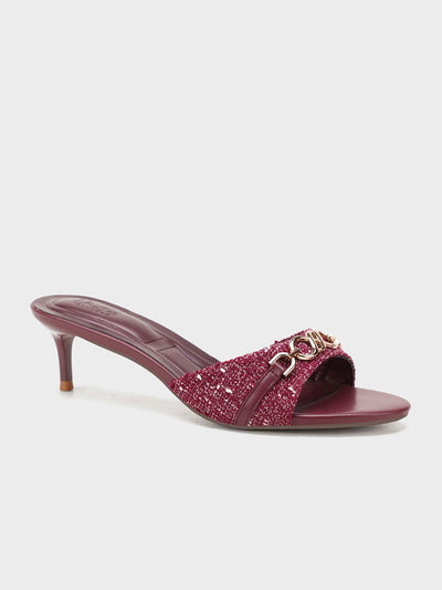 These stylish slip-on heel sandals are perfect for casual or party wear. Designed with a shiny front strap and gold chain detail, they add a trendy touch to any outfit. The low heel makes them comfortable for long use.