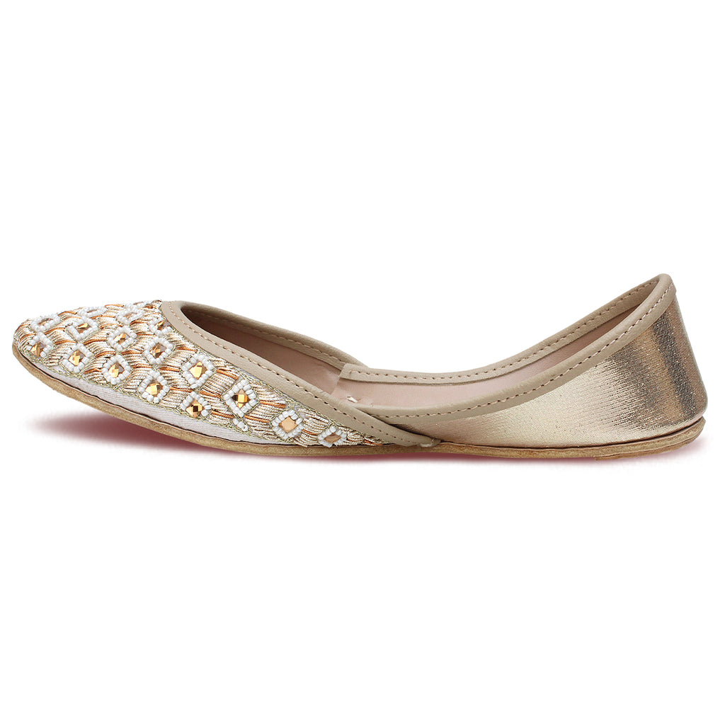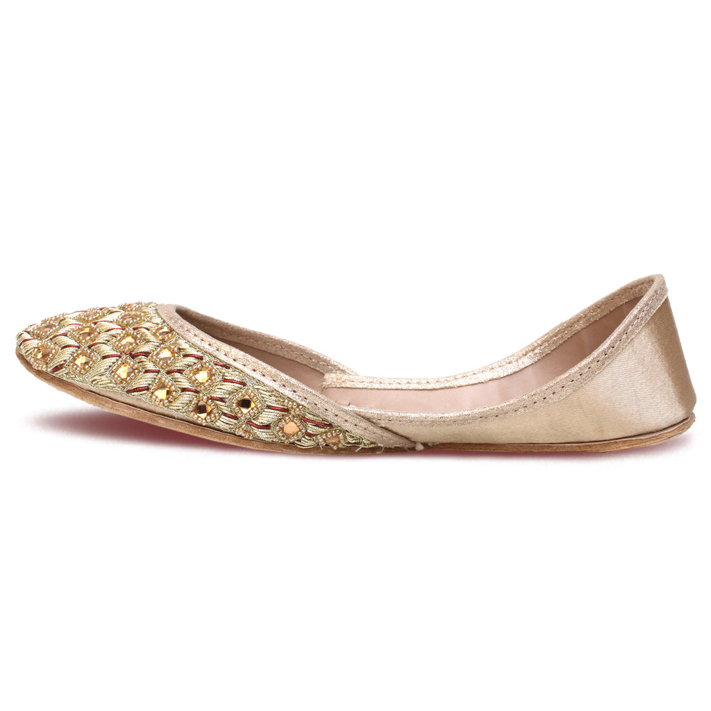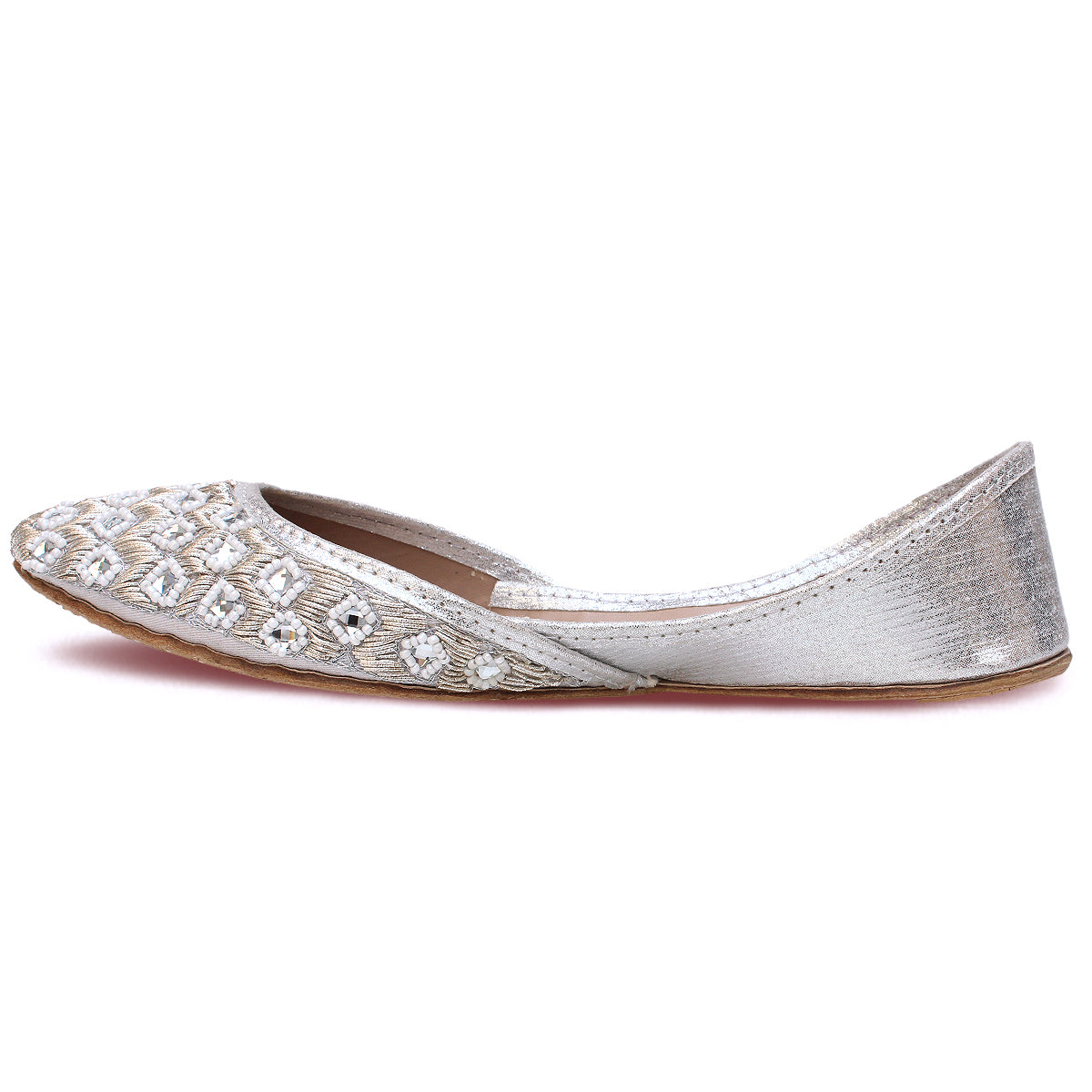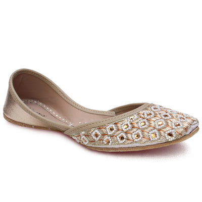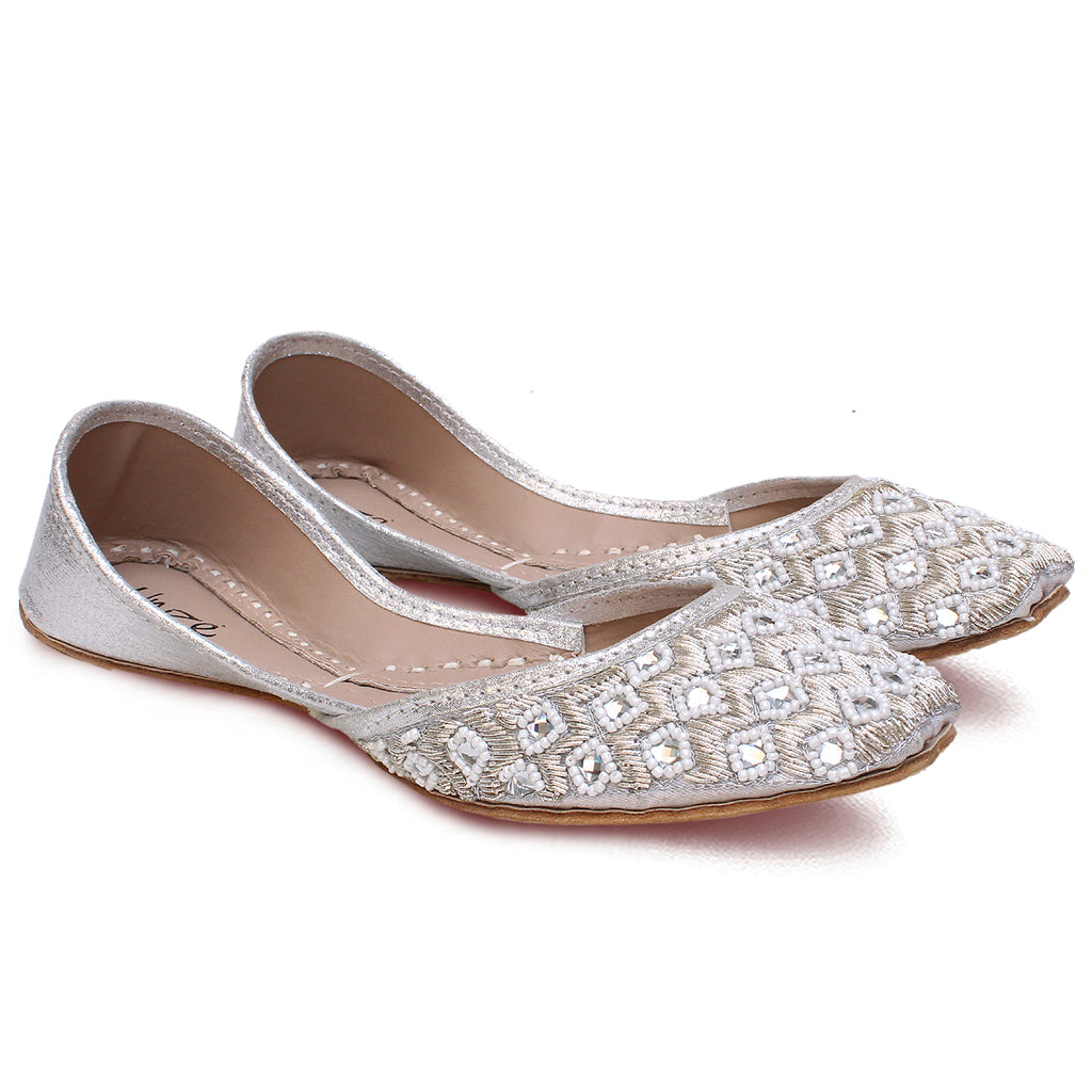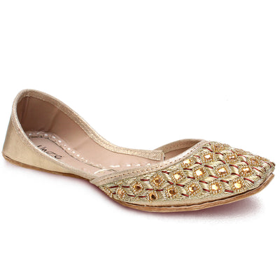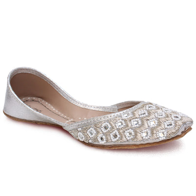 This handcrafted Flat Khussa for ladies showcases a leather sole and a cushioned insole adorned with teardrop diamantes. It is meticulously crafted using hand-stitched materials.