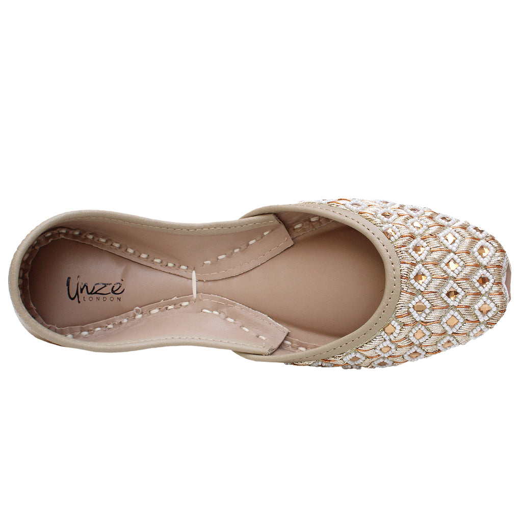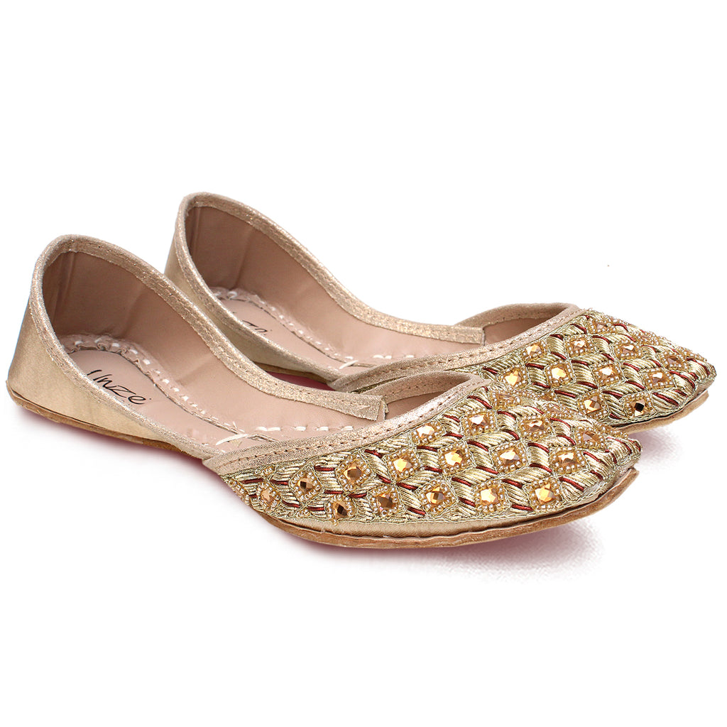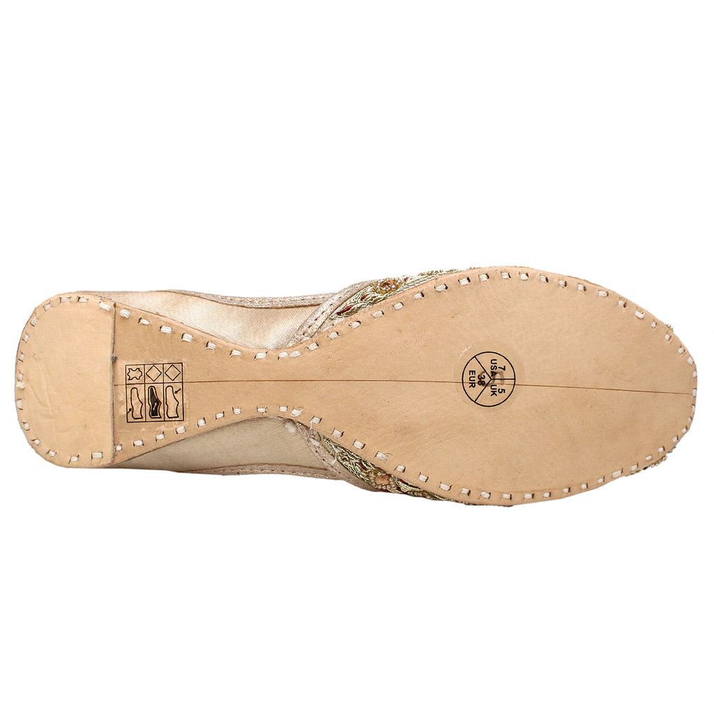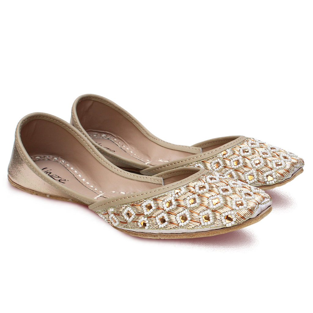 This handcrafted Flat Khussa for ladies showcases a leather sole and a cushioned insole adorned with teardrop diamantes. It is meticulously crafted using hand-stitched materials.