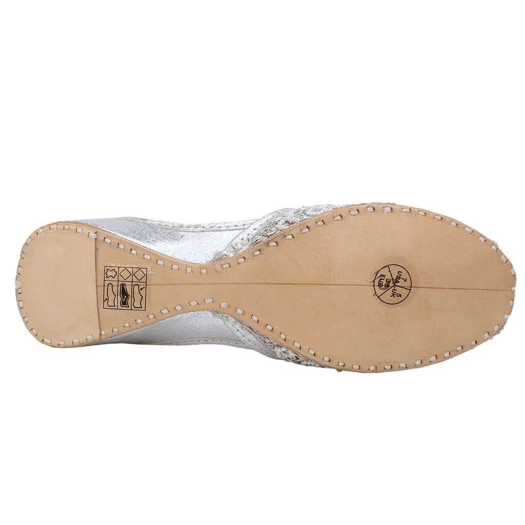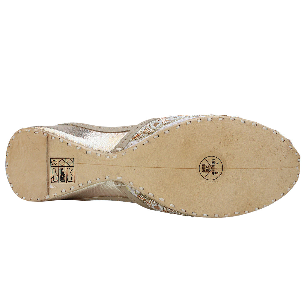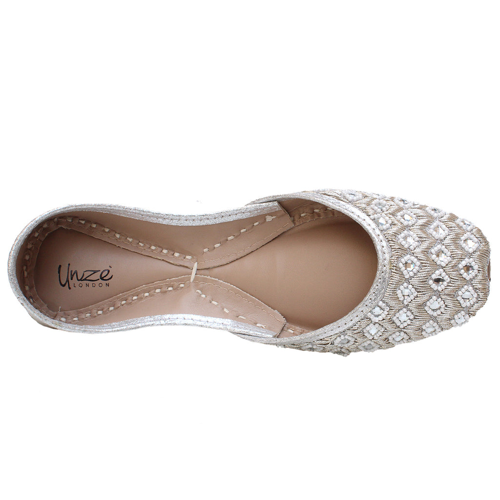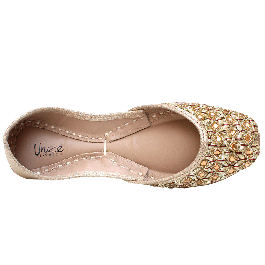 This handcrafted Flat Khussa for ladies showcases a leather sole and a cushioned insole adorned with teardrop diamantes. It is meticulously crafted using hand-stitched materials.