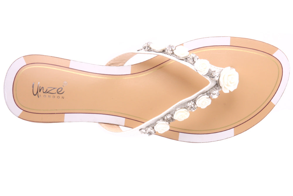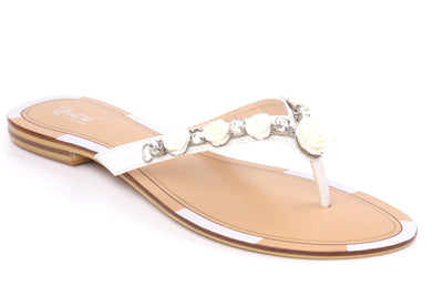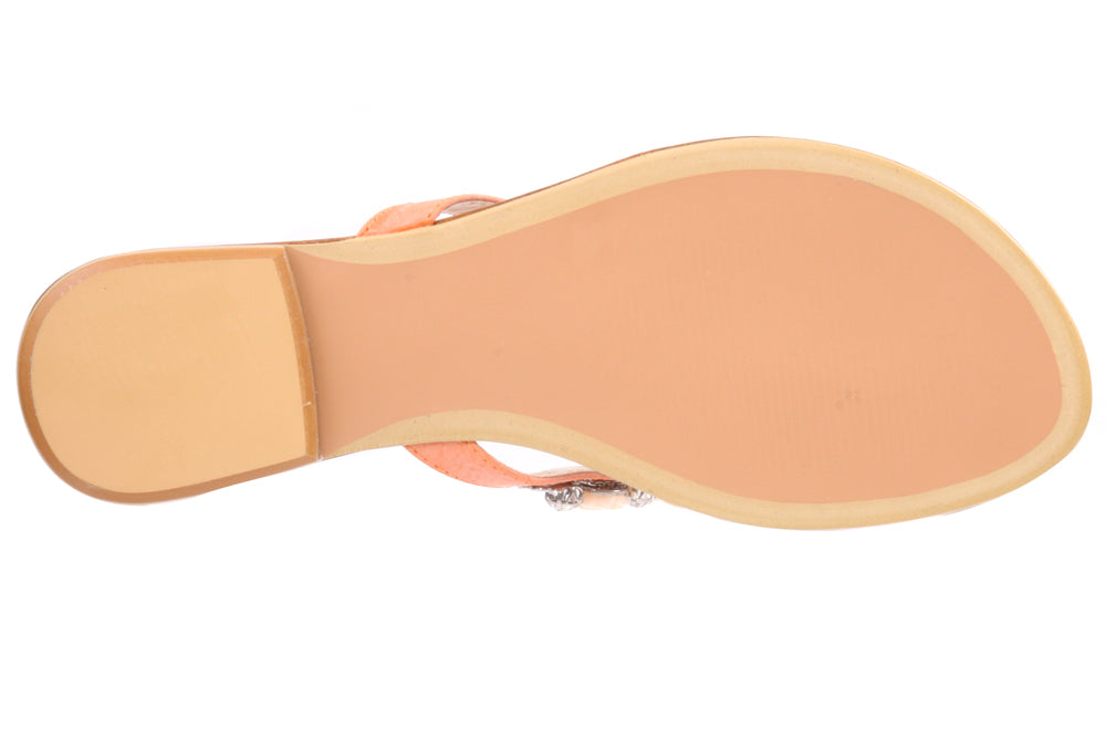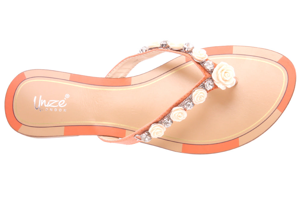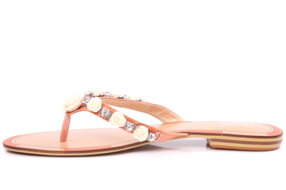Spring brings colors and fun so these chic floral designed thong slippers. Metallic rose designed buckles adorned the v-bar with easy slipon construction and flat sole. Style No: L24420 Colour: Orange
