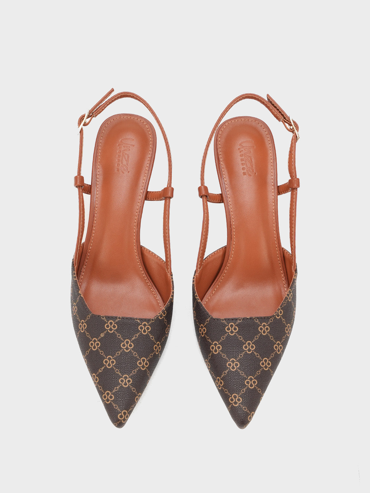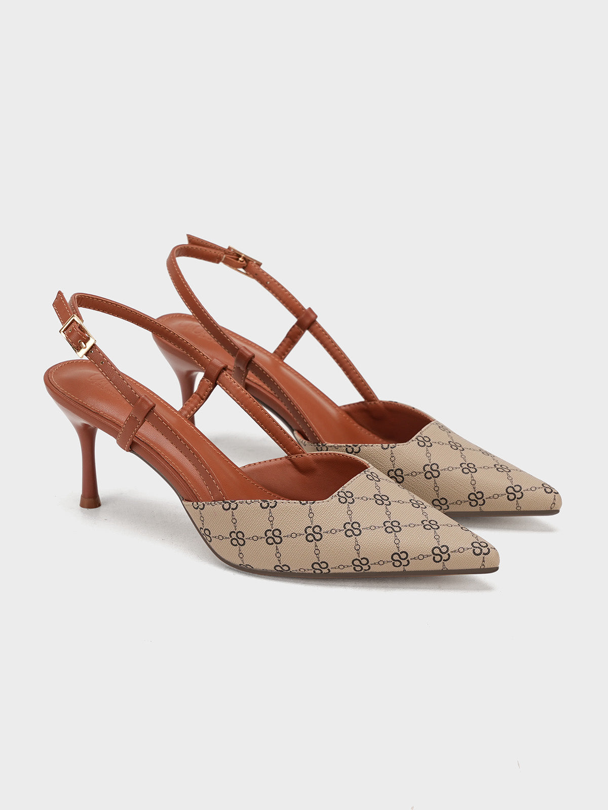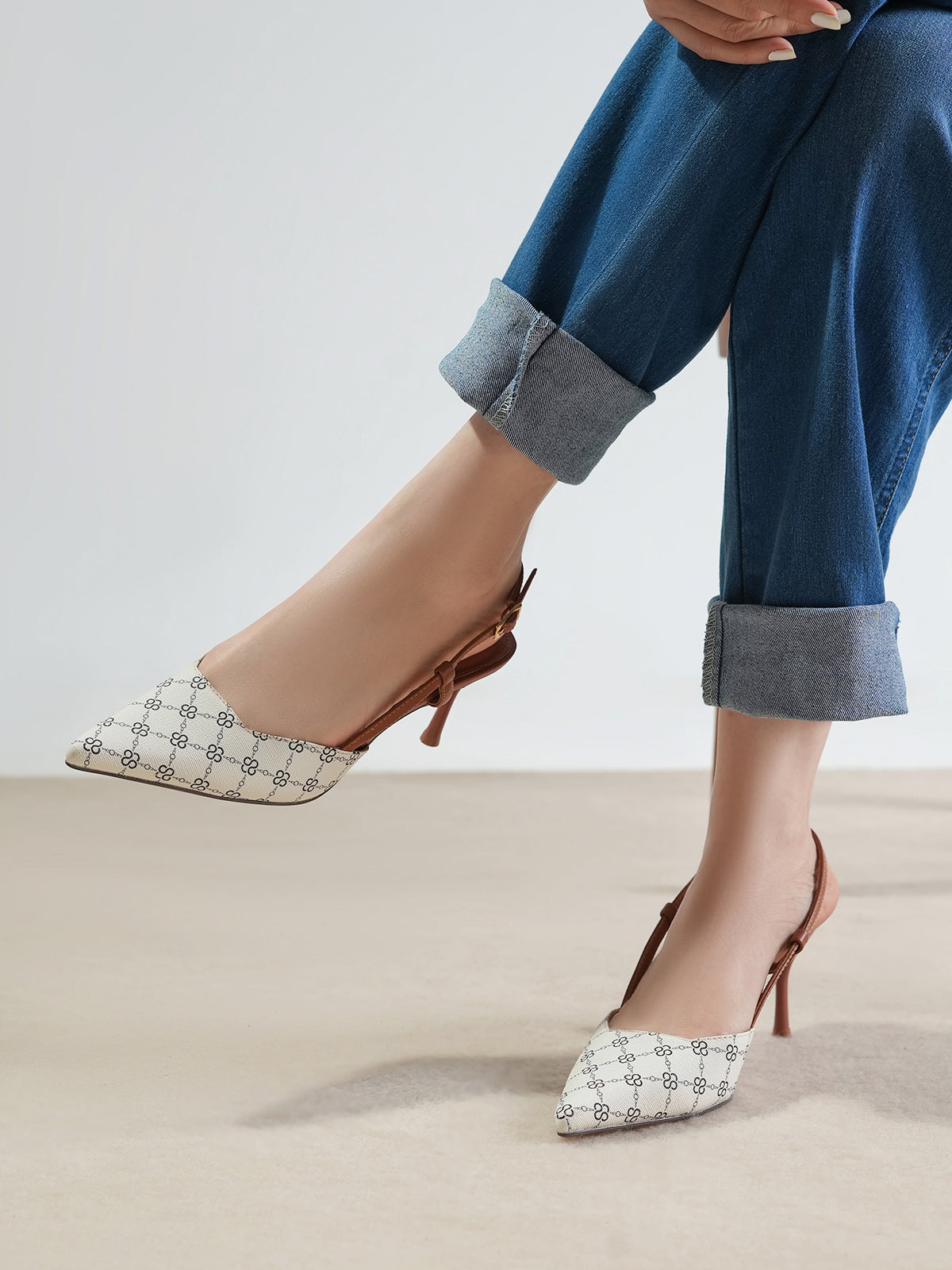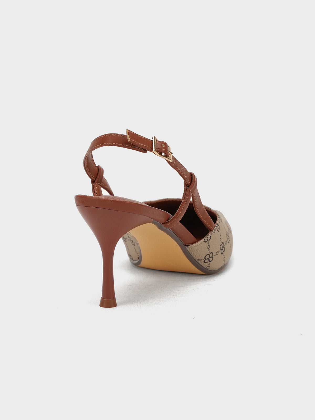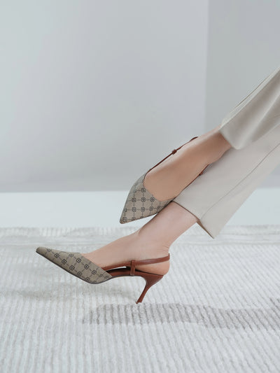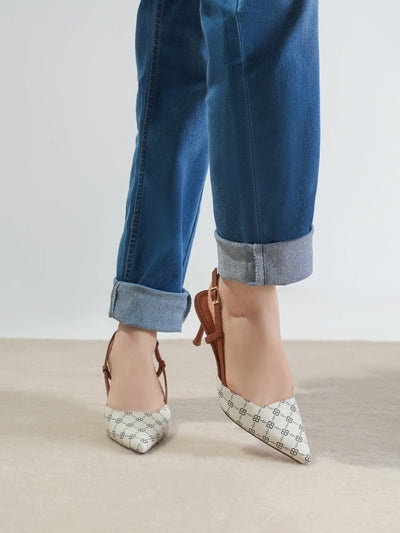 This women’s sandal showcases a sleek pointed toe with a stylish printed design, paired with a slim buckle strap for a secure fit. The slingback straps and stiletto heel add a touch of elegance, making it perfect for formal events, parties, or stylish day wear.