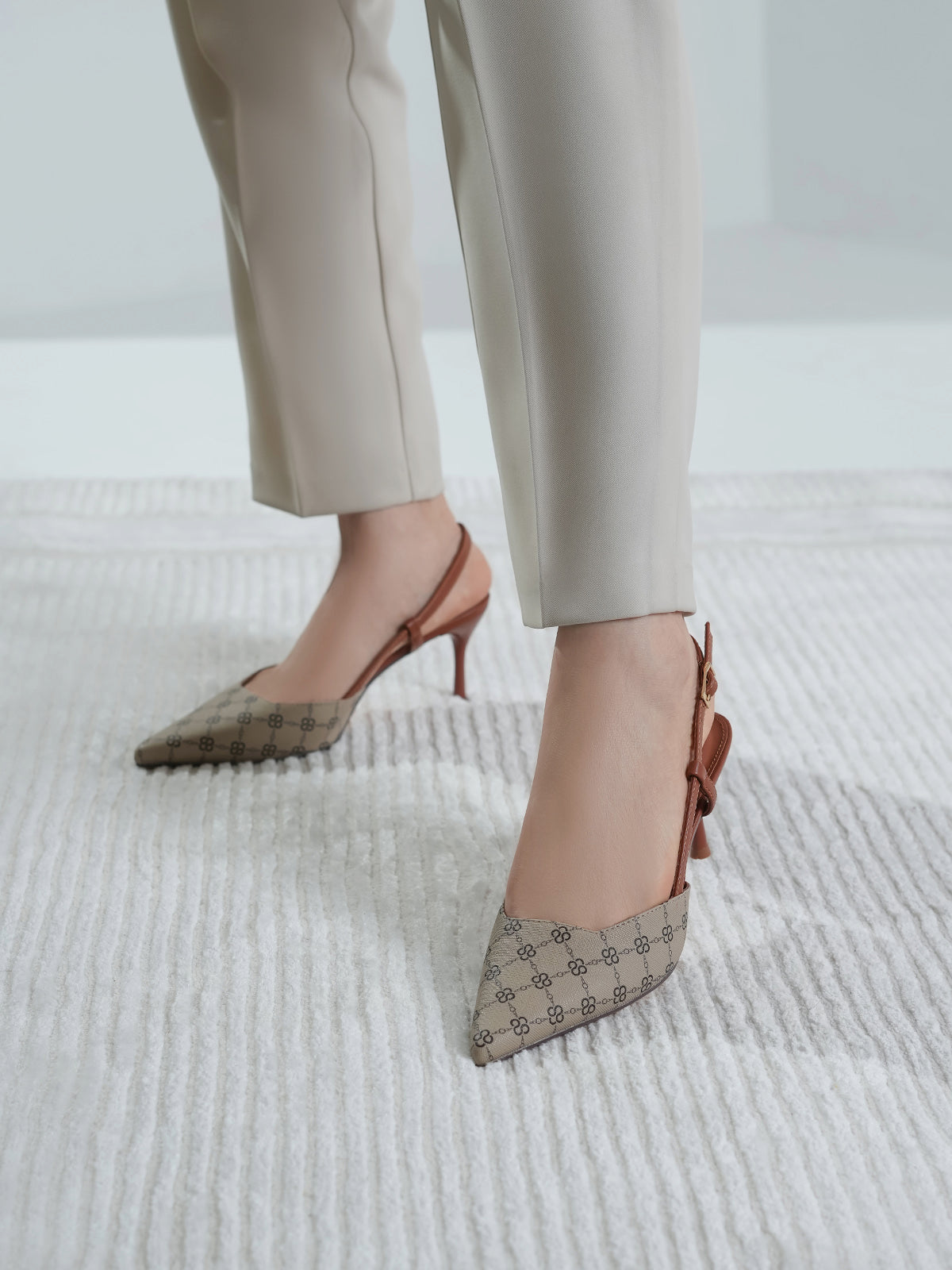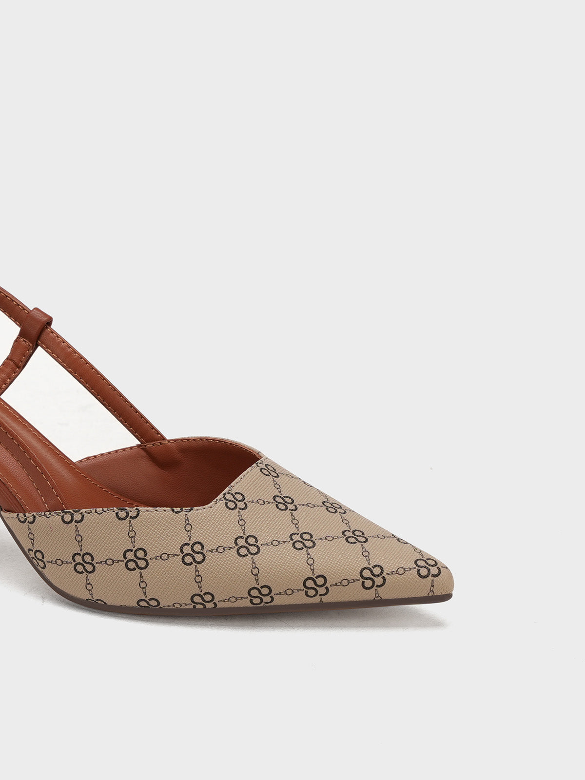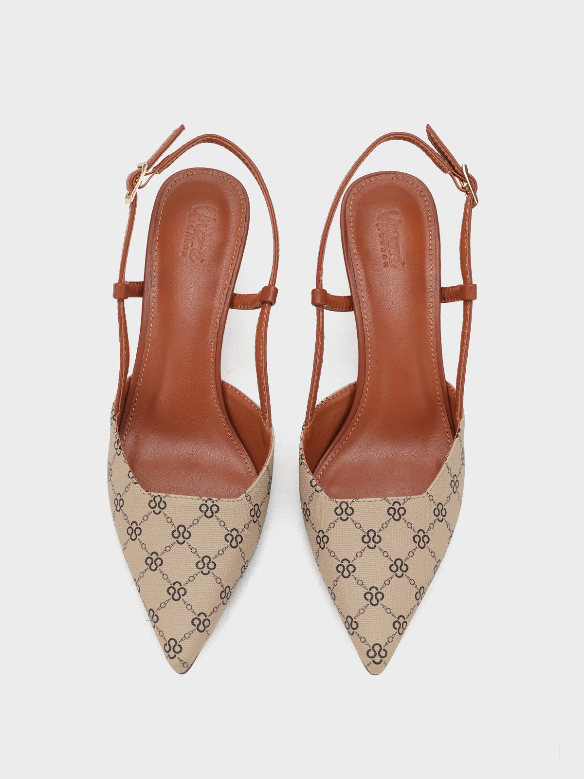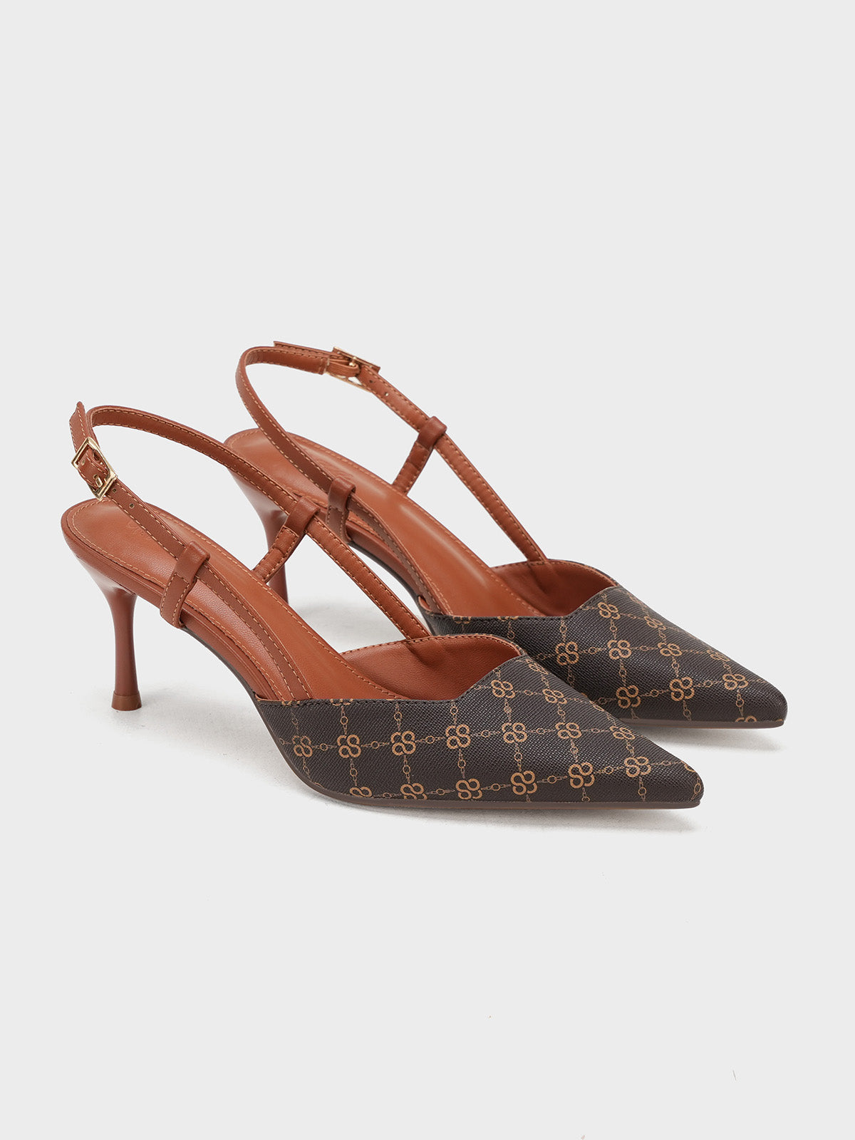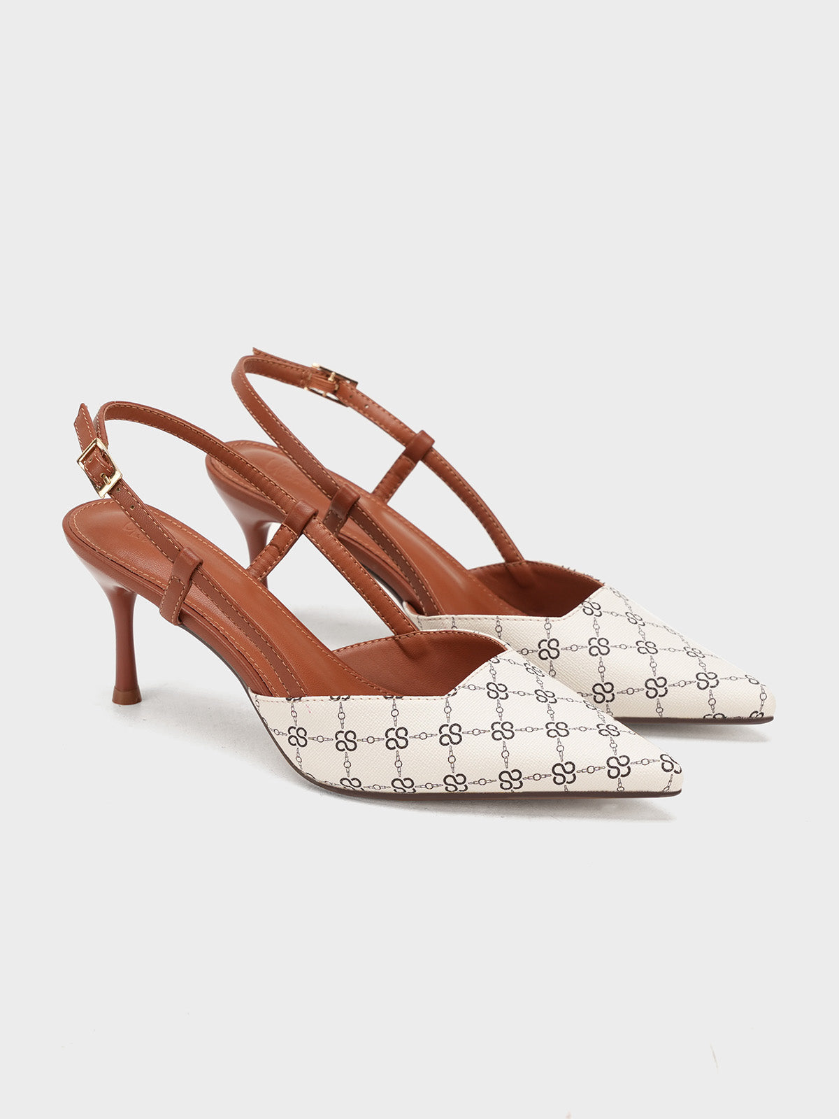 This women’s sandal showcases a sleek pointed toe with a stylish printed design, paired with a slim buckle strap for a secure fit. The slingback straps and stiletto heel add a touch of elegance, making it perfect for formal events, parties, or stylish day wear.