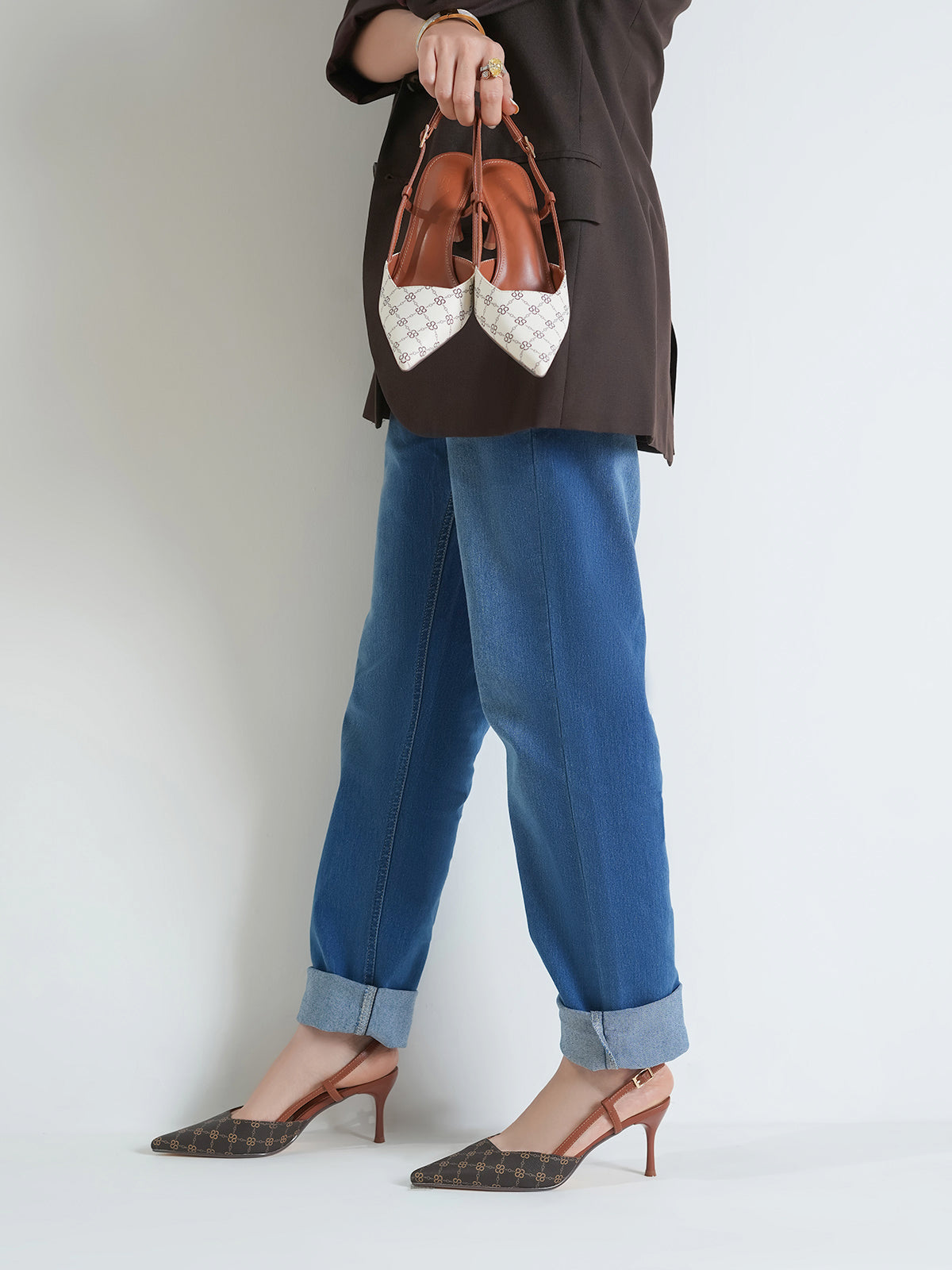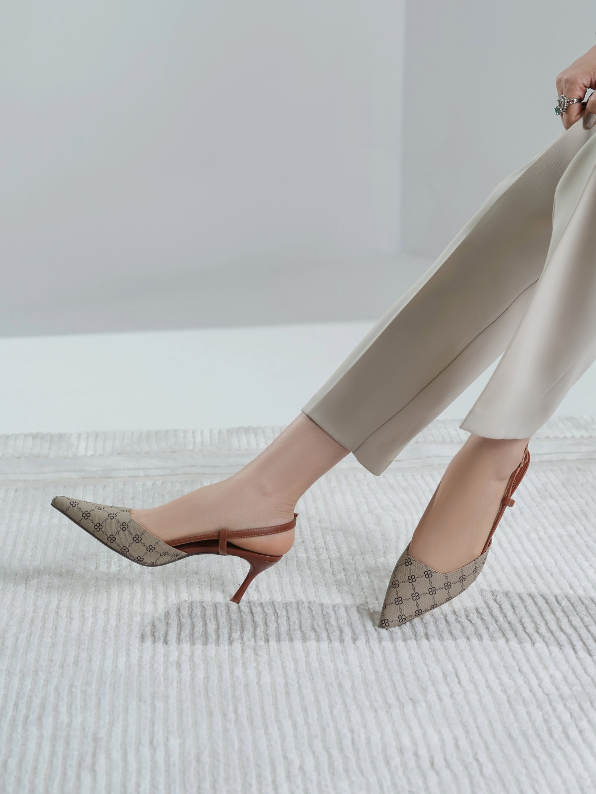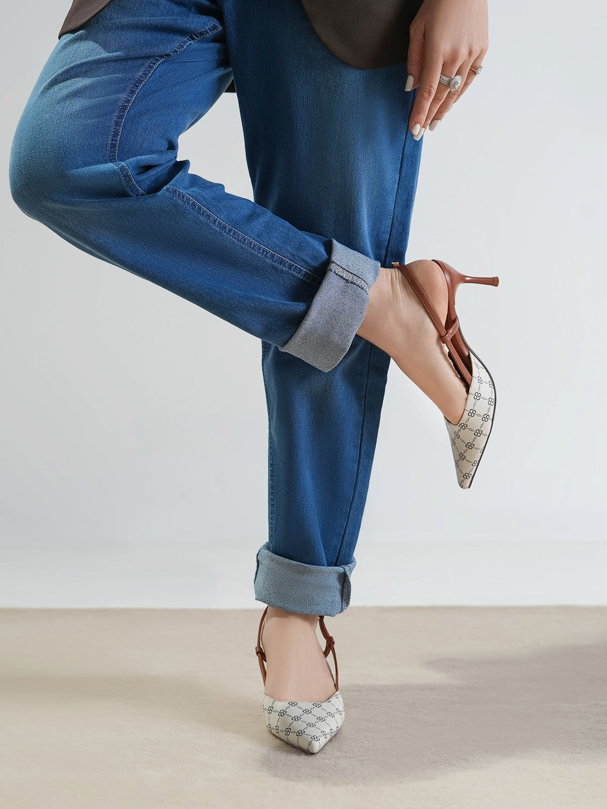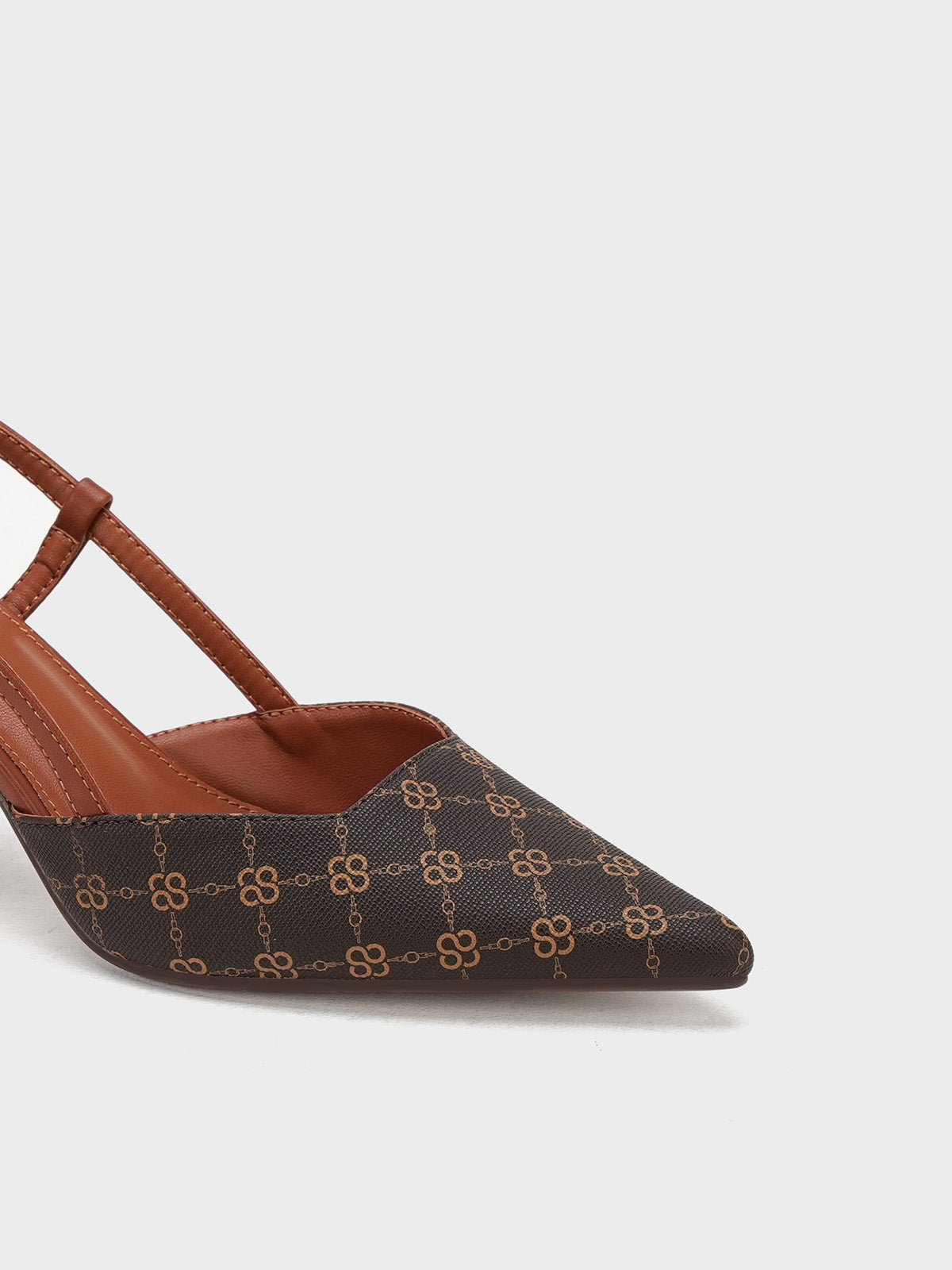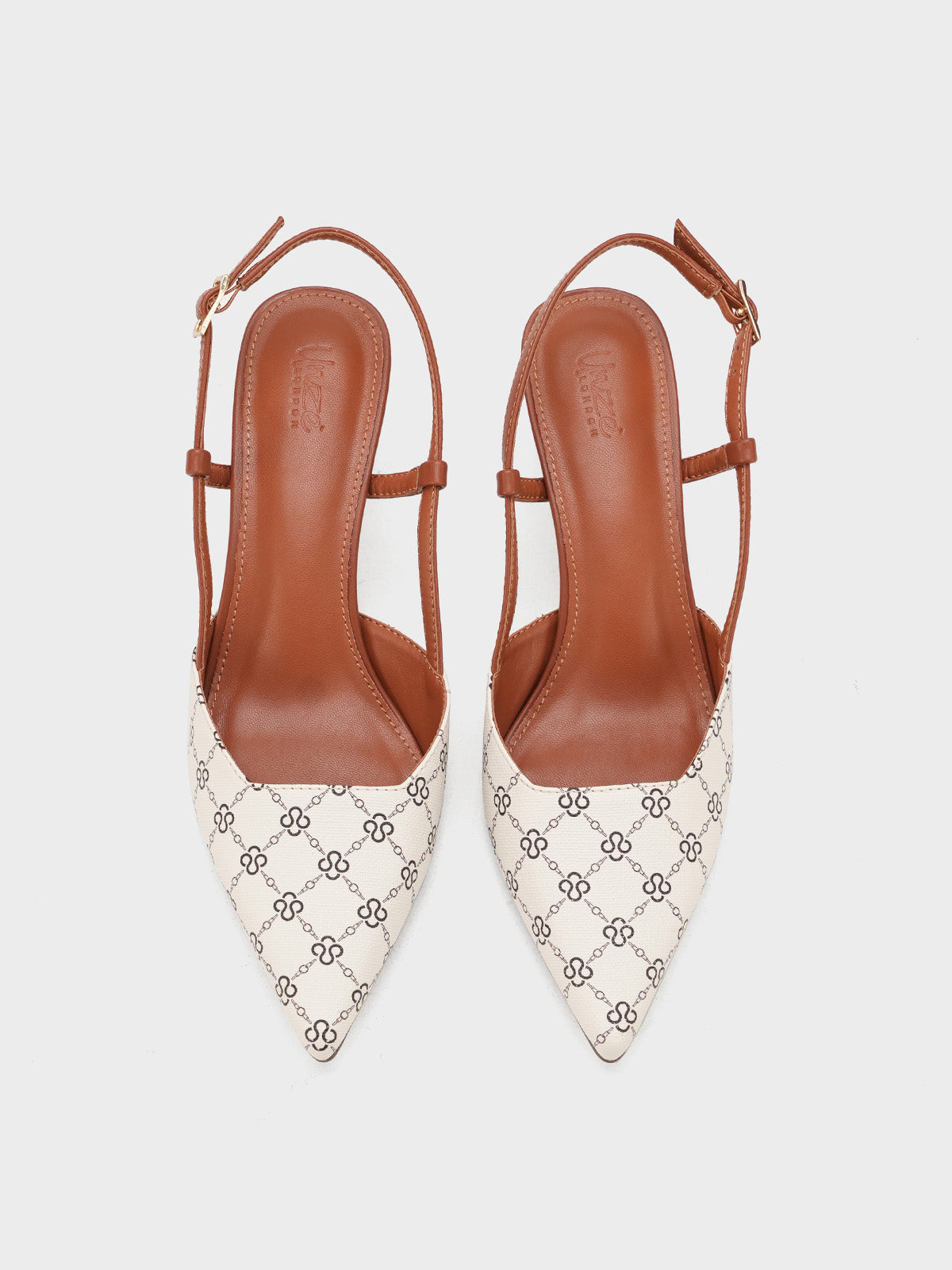 This women’s sandal showcases a sleek pointed toe with a stylish printed design, paired with a slim buckle strap for a secure fit. The slingback straps and stiletto heel add a touch of elegance, making it perfect for formal events, parties, or stylish day wear.