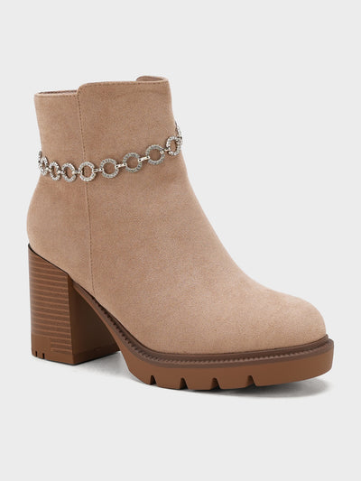 Make a bold statement with these women’s ankle boots featuring a stylish chain detail around the ankle. The sleek design is elevated with a sturdy block heel that adds height without compromising comfort. Perfect for adding a touch of edge to your outfit.