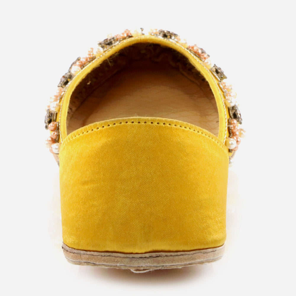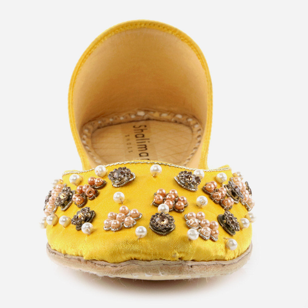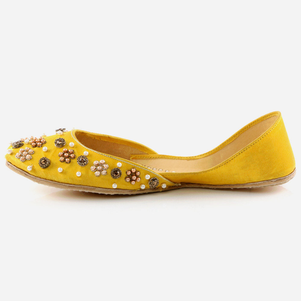 Conjure a melodious starry night with these Rhinestone embellished Shalimar Shoes Indian Flat Leather Khussa. This year our new Indian Khussa collection is fully decorated. The fully diamante upper puts shimmer and shine in each step while the silhouette is simple, slender and perfectly sweet. These shoes are truly stylish piece made by expert craftsman. It’s beautifully embellished with pearls and crystals to give formal look. And padded in-socks add comfort in it. These Mojaris can be worn either left or right, doesn’t make any difference