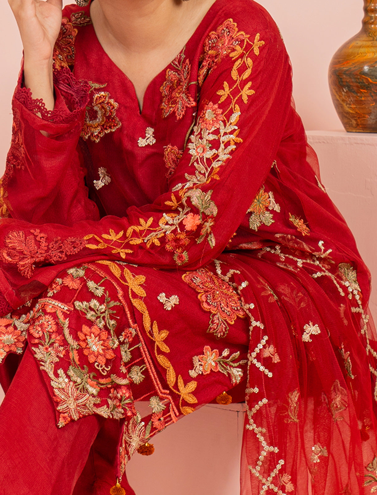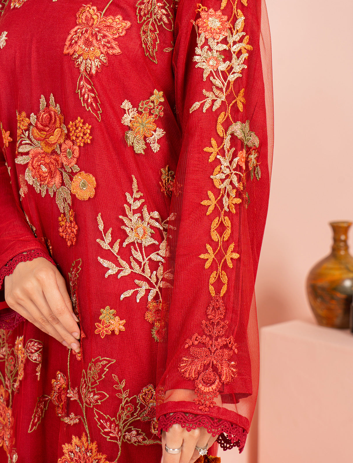 This stunning long shirt is intricately designed and crafted from the highest quality staple net fabric in a rich maroon shade. The embellishments are truly exquisite, featuring a shimmery direct adda spread at the center panel and neckline, as well as embroidered sleeves, a foil hem, and delicate lace trimmings. To complete the look, this ensemble includes a gorgeously embroidered net dupatta with heavy threadwork and kiran lace finishing, paired with a widely flared raw silk trouser.Overall, this outfit is a true masterpiece, combining intricate design, high-quality materials, and stunning embellishments to create a truly unforgettable look. Whether you're attending a formal event or simply want to make a statement, this ensemble is sure to turn heads and leave a lasting impression.