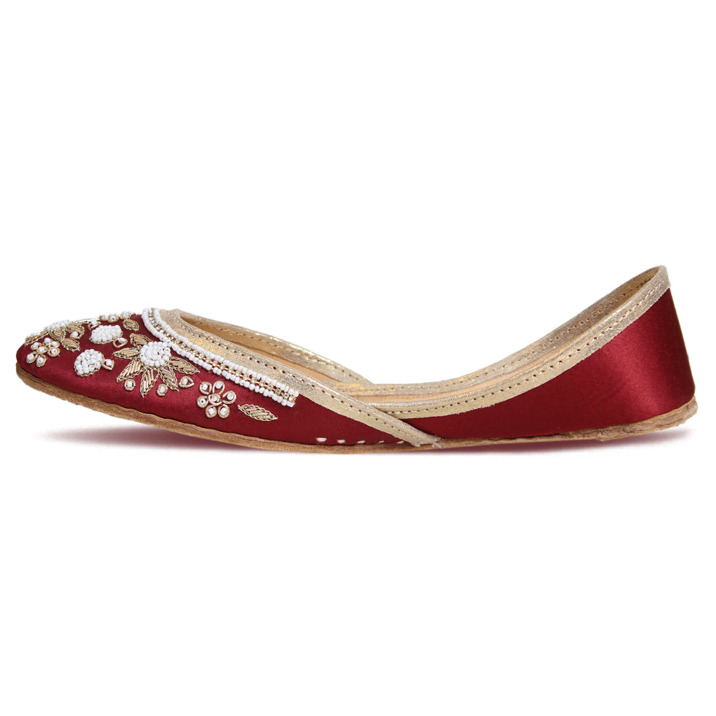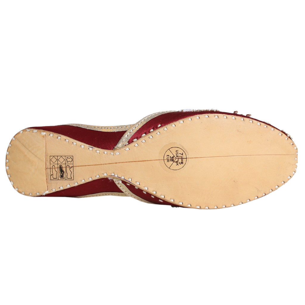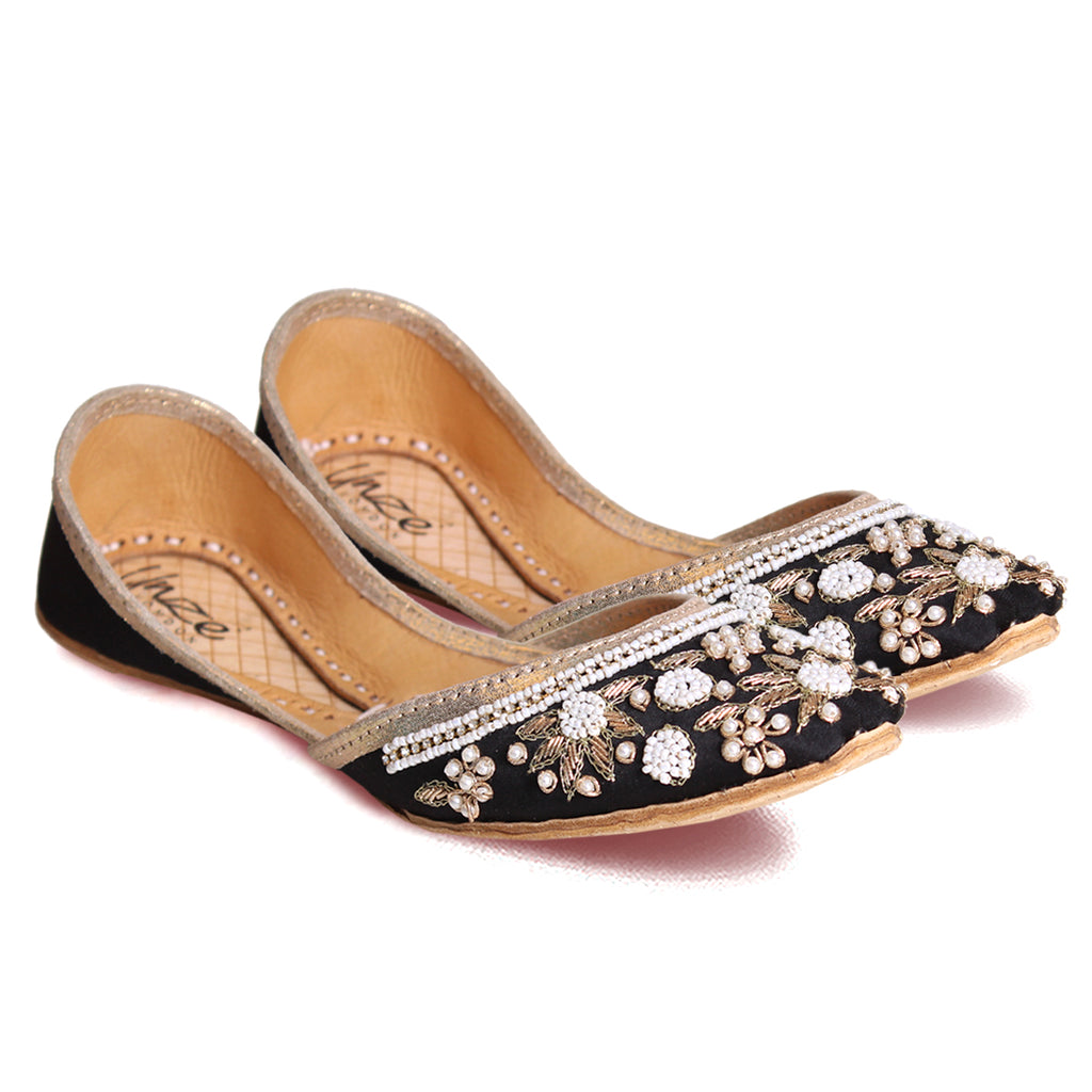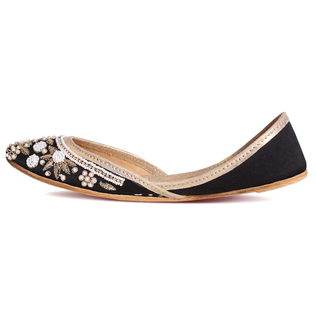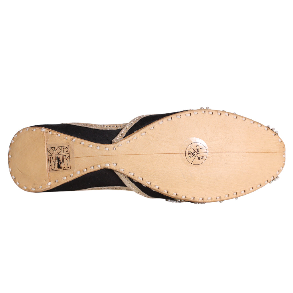 Introducing a unique twist on your go-to daytime flats - the Flat Khussa style ballerina. Elevate any evening look with these expertly crafted, manmade net khussa shoes. The top of the shoe features intricate net detailing, beautifully accented with diamond-shaped boxes. The entire shoe is adorned with stunning beadwork and tilla embroidery, showcasing the true craftsmanship of our experts.