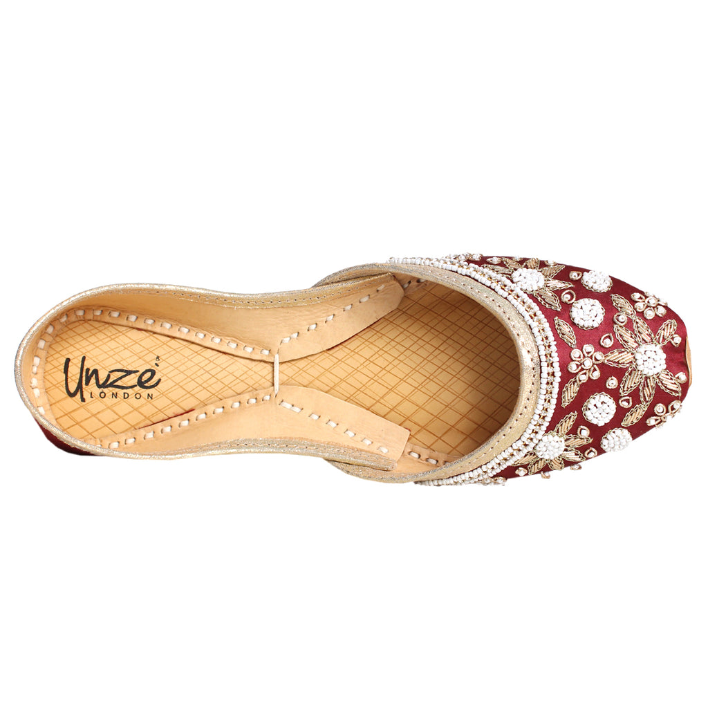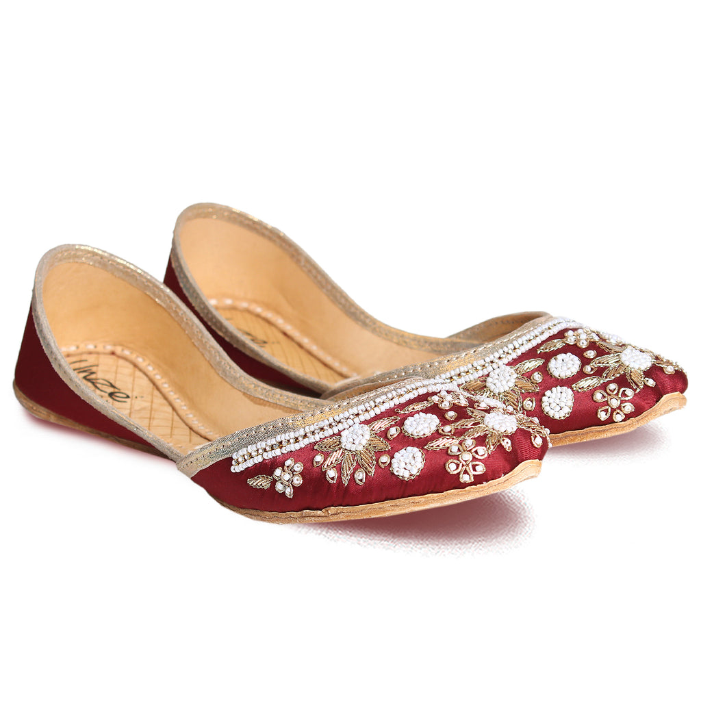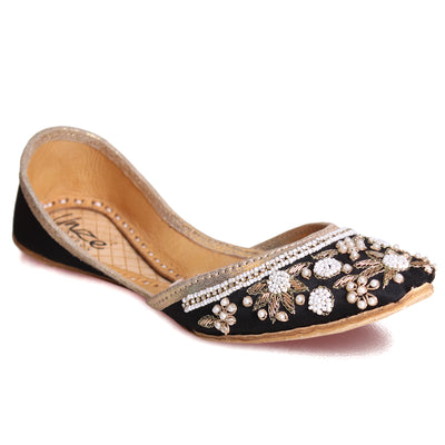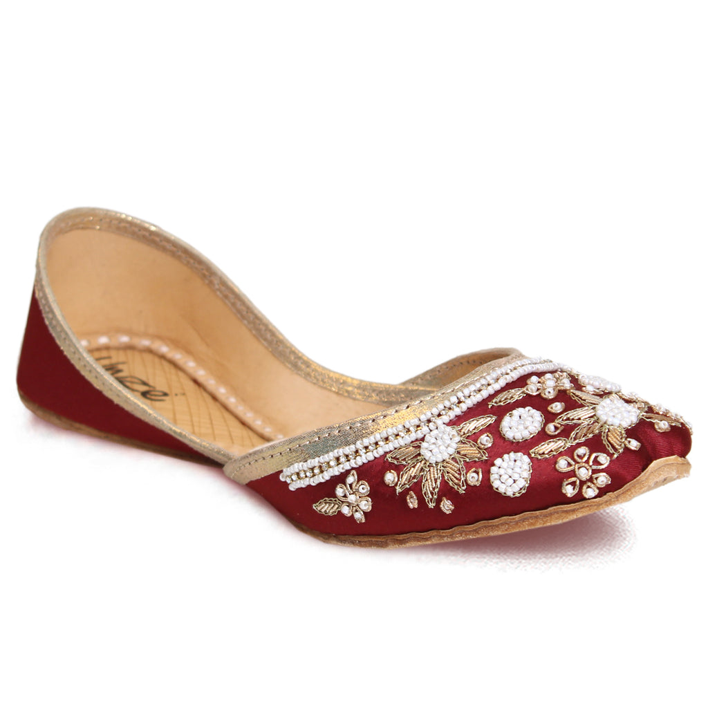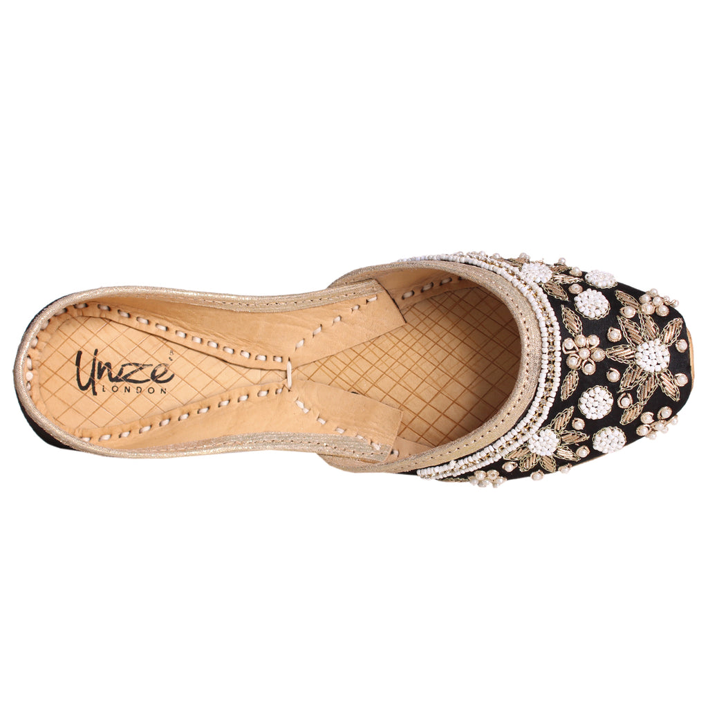 Introducing a unique twist on your go-to daytime flats - the Flat Khussa style ballerina. Elevate any evening look with these expertly crafted, manmade net khussa shoes. The top of the shoe features intricate net detailing, beautifully accented with diamond-shaped boxes. The entire shoe is adorned with stunning beadwork and tilla embroidery, showcasing the true craftsmanship of our experts.